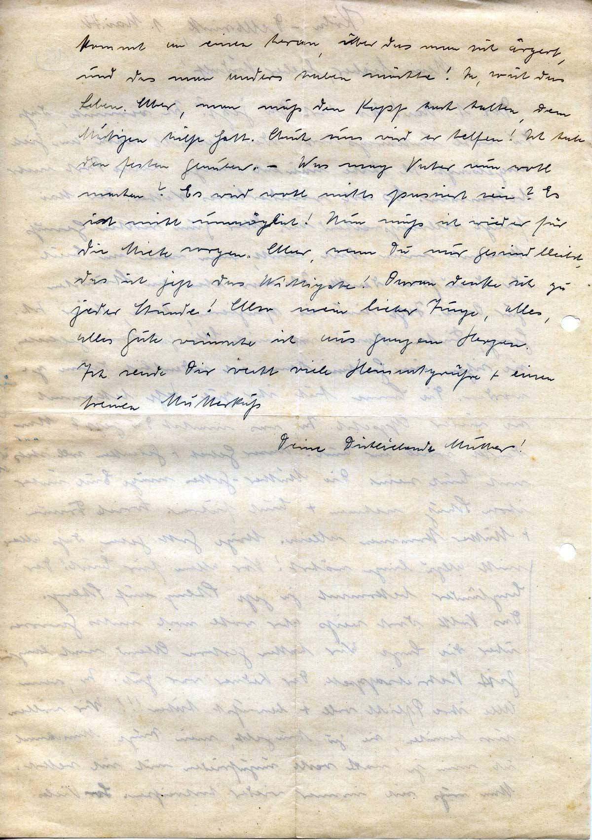 kommt an einen heran, über das man sich ärgert, und das man anders haben möchte! Ja, so ist das Leben. Aber, man muß den Kopf hoch halten, dem Mutigen hilft Gott. Auch uns wird er helfen! Ich habe den festen Glauben. – Was mag Vater nun wohl machen? Es wird wohl nichts passiert sein? Es ist nicht unmöglich! Nun muß ich wieder für die Miete sorgen. Aber, wenn Du nur gesund bleibst, das ist jetzt das Wichtigste! Daran denke ich zu jeder Stunde! Also mein lieber Junge, alles, alles Gute wünsche ich aus ganzem Herzen. Ich sende Dir recht viele Heimatgrüße + einen treuen Mutterkuß