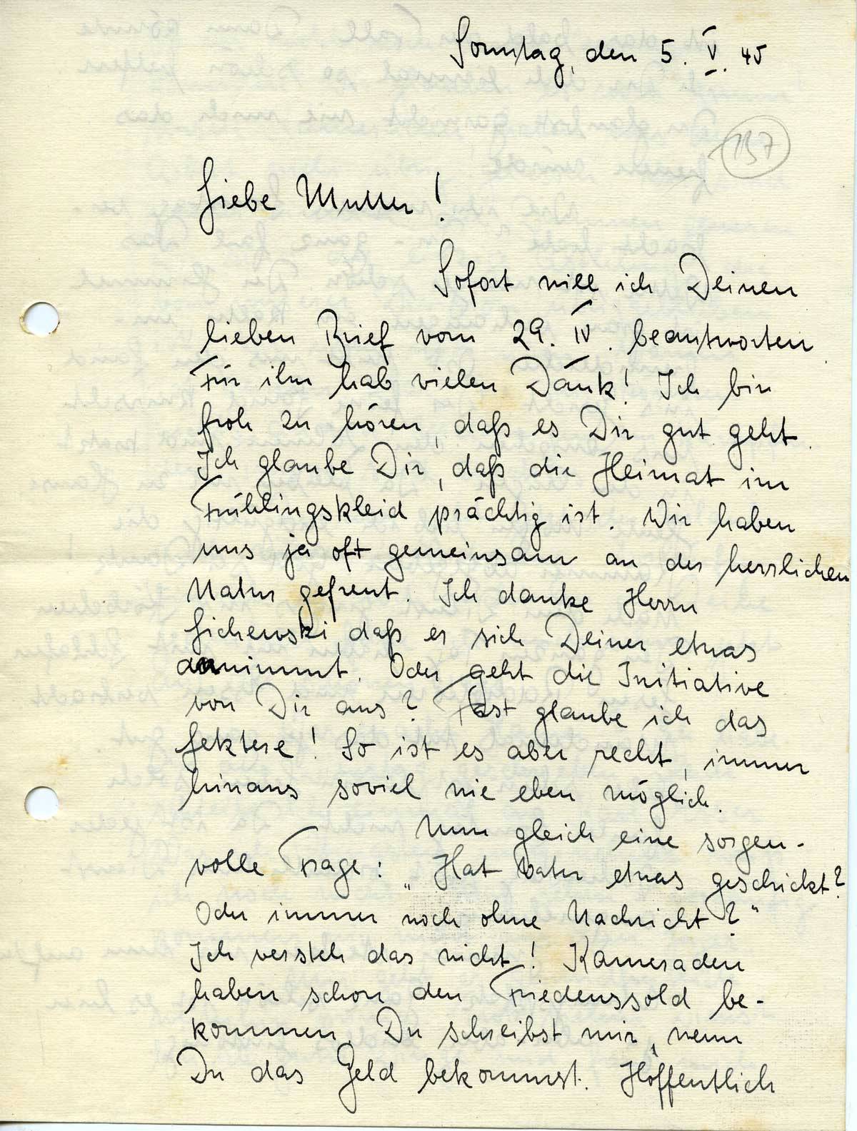 Nun gleich eine sorgenvolle Frage: „Hat Vater etwas geschickt? Oder immer noch ohne Nachricht?“ Ich versteh das nicht! Kameraden haben schon den Friedenssold bekommen. Du schreibst mir, wenn Du das Geld bekommst. Hoffentlich