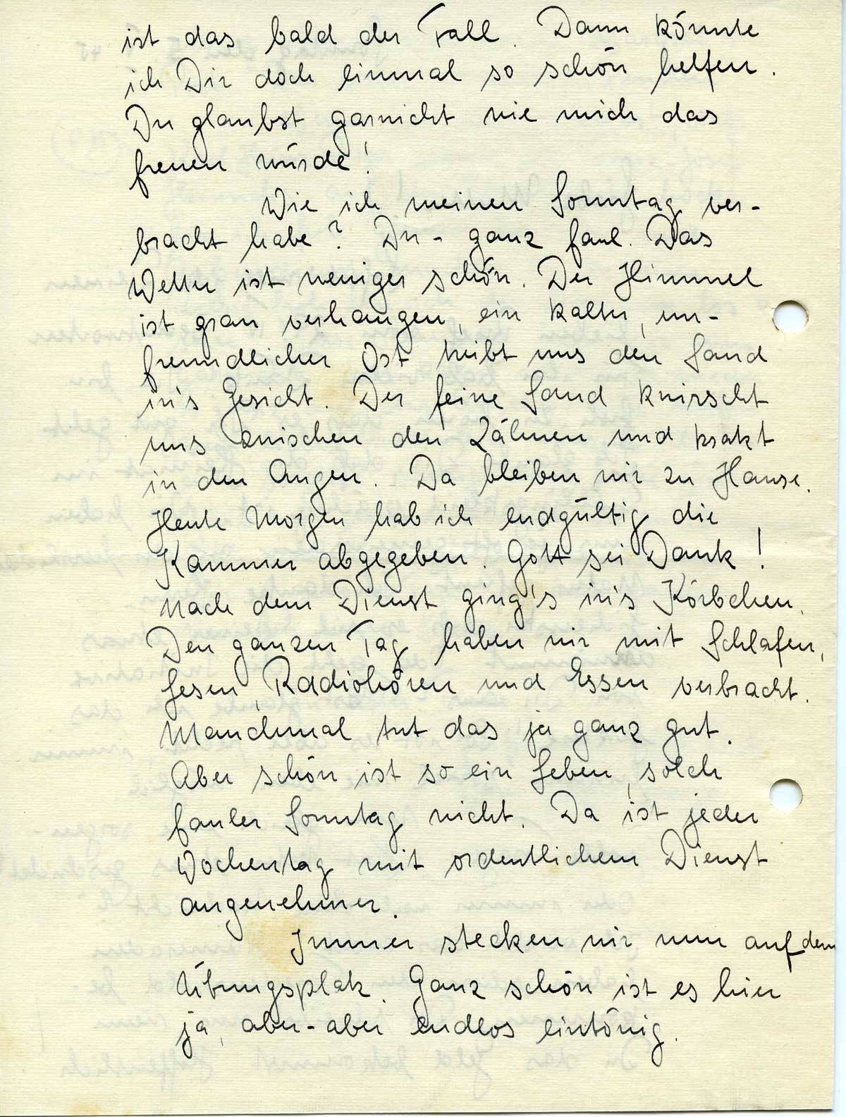Wie ich meinen Sonntag verbracht habe? Du – ganz faul. Das Wetter ist weniger schön. Der Himmel ist grau verhangen, ein kalter, unfreundlicher Ost treibt uns den Sand in’s Gesicht. Der feine Sand knirscht uns zwischen den Zähnen und kratzt in den Augen. Da bleiben wir zu Hause. Heute Morgen hab ich endgültig die Kammer abgegeben. Gott sei Dank! Nach dem Dienst ging’s in’s Körbchen. Den ganzen Tag haben wir mit Schlafen, Lesen, Radiohören und Essen verbracht. Manchmal tut das ja ganz gut. Aber schön ist so ein Leben, solch fauler Sonntag nicht. Da ist jeder Wochentag mit ordentlichem Dienst angenehmer.