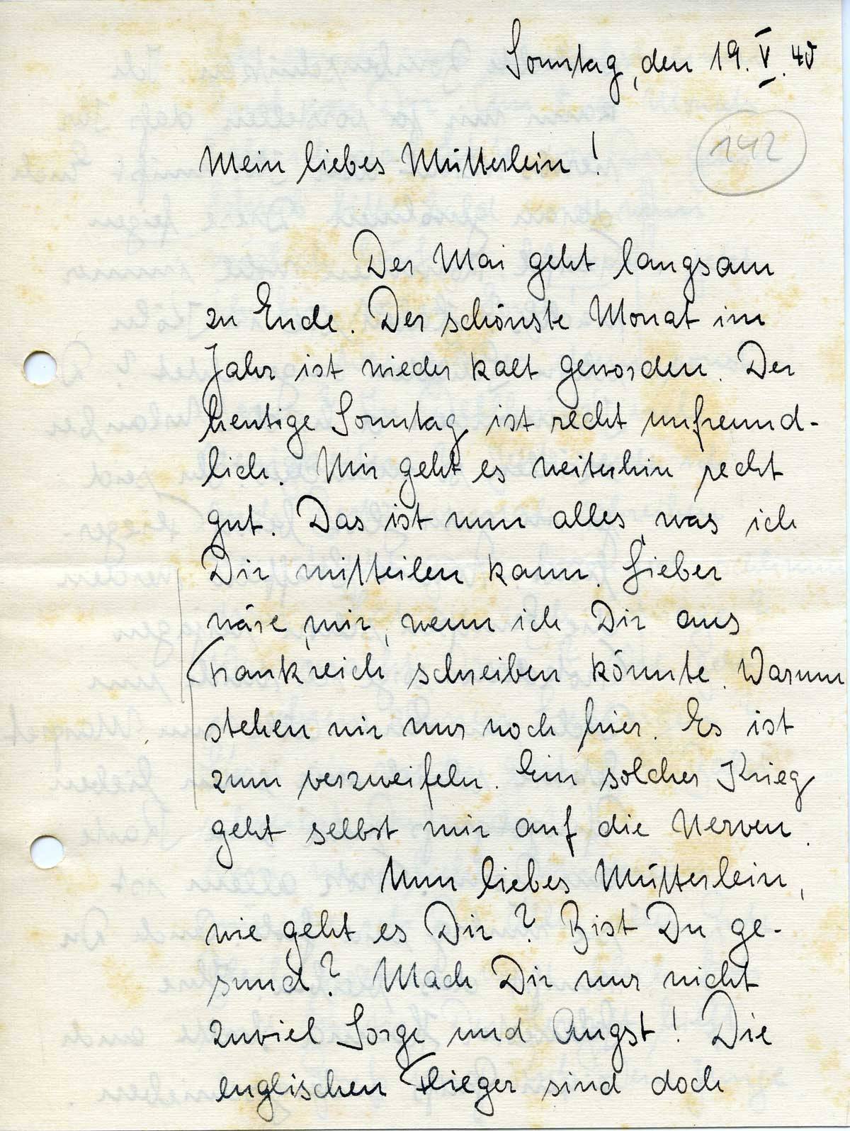 Der Mai geht langsam zu Ende. Der schönste Monat im Jahr ist wieder kalt geworden. Der heutige Sonntag ist recht unfreundlich. Mir geht es weiterhin recht gut. Das ist nun alles, was ich Dir mitteilen kann. Lieber wäre mir, wenn ich Dir aus Frankreich schreiben könnte. Warum stehen wir nur noch hier. Es ist zum verzweifeln. Ein solcher Krieg geht selbst mir auf die Nerven.