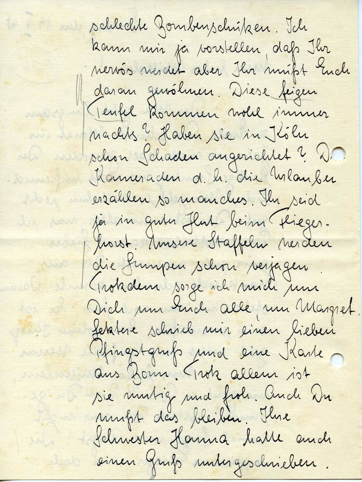 schlechte Bombenschützen. Ich kann mir ja vorstellen, daß Ihr nervös werdet aber Ihr müßt Euch daran gewöhnen. Diese feigen Teufel kommen wohl immer nachts? Haben sie in Köln schon Schaden angerichtet? Kameraden d. h. die Urlauber erzählen so manches. Ihr seid ja in guter Hut beim Fliegerhorst. Unsere Staffeln werden die Lumpen schon verjagen. Trotzdem sorge ich mich um Dich um Euch alle, um Margret. Letztere schrieb mir einen lieben Pfingstgruß und eine Karte aus Bonn. Trotz allem ist sie mutig und froh. Auch Du mußt das bleiben. Ihre Schwester Hanna hatte auch einen Gruß untergeschrieben.