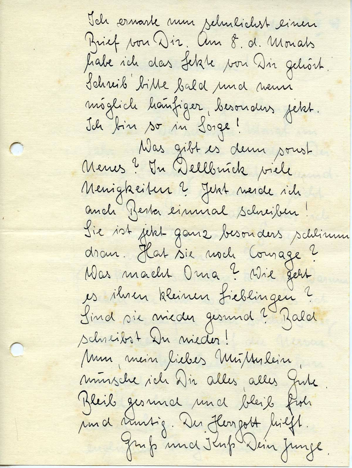 Was gibt es denn sonst Neues? In Dellbrück viele Neuigkeiten? Jetzt werde ich auch Berta einmal schreiben! Sie ist jetzt ganz besonders schlimm dran. Hat sie noch Courage? Was macht Oma? Wie geht es ihren kleinen Lieblingen? Sind sie wieder gesund? Bald schreibst Du wieder!