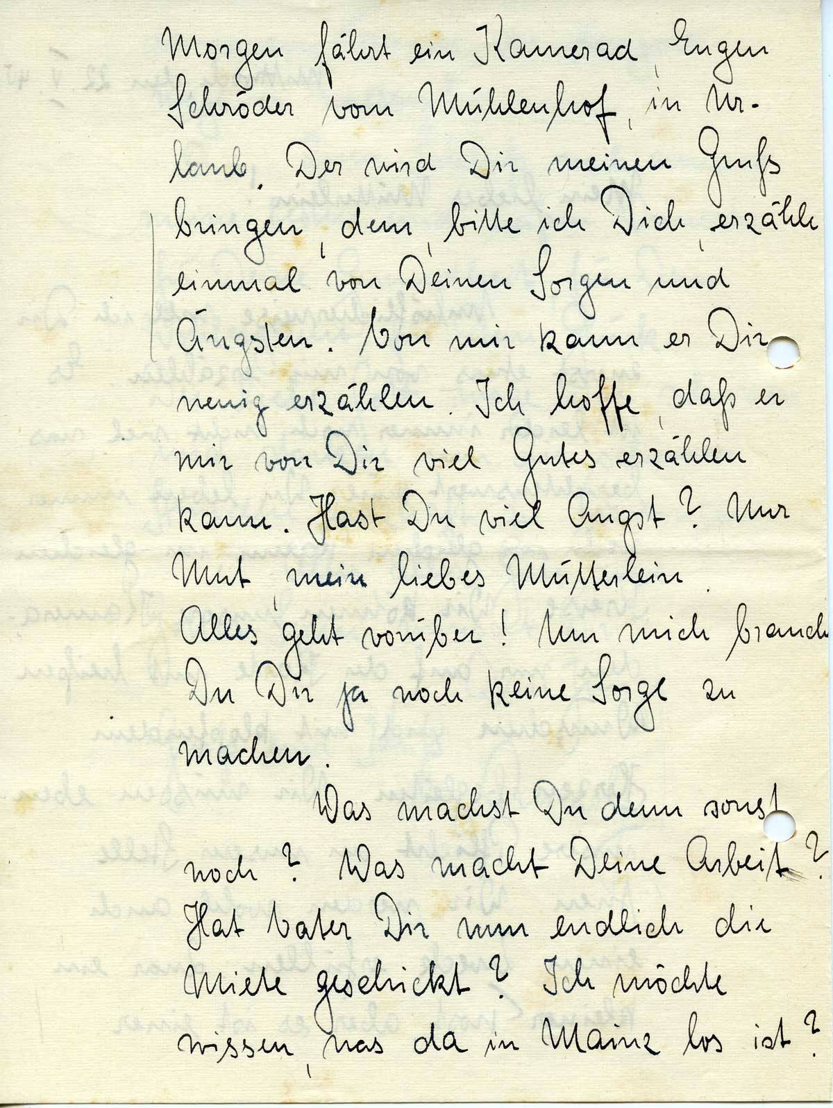 Morgen fährt ein Kamerad, Eugen Schröder vom Mühlenhof, in Urlaub. Der wird Dir meinen Gruß bringen, dem, bitte ich Dich, erzähle einmal von Deinen Sorgen und Ängsten. Von mir kann er Dir wenig erzählen. Ich hoffe, daß er mir von Dir viel Gutes erzählen kann. Hast Du viel Angst? Nur Mut, mein liebes Mütterlein.