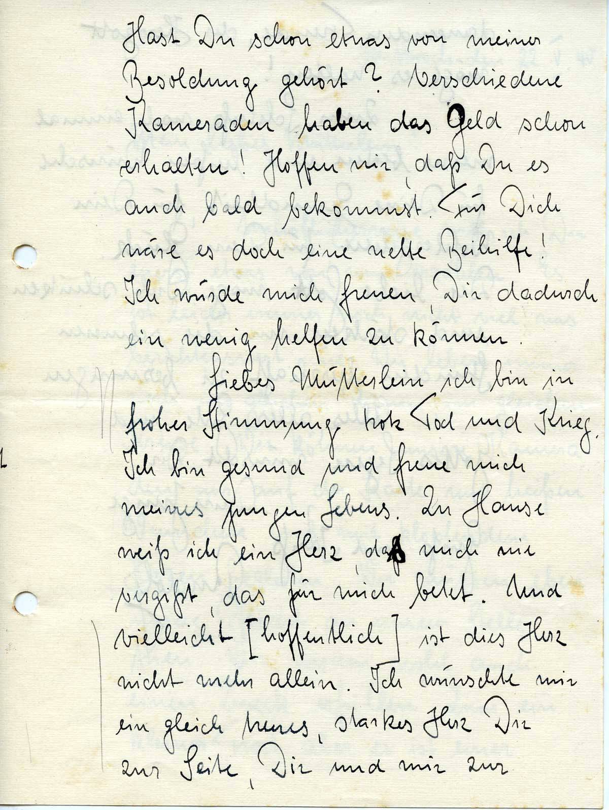 Liebes Mütterlein, ich bin in froher Stimmung trotz Tod und Krieg. Ich bin gesund und freue mich meines jungen Lebens. Zu Hause weiß ich ein Herz, daß mich nie vergißt, das für mich betet. Und vielleicht [hoffentlich] ist dies Herz nicht mehr allein. Ich wünschte mir ein gleich treues, starkes Herz Dir zur Seite, Dir und mir zur