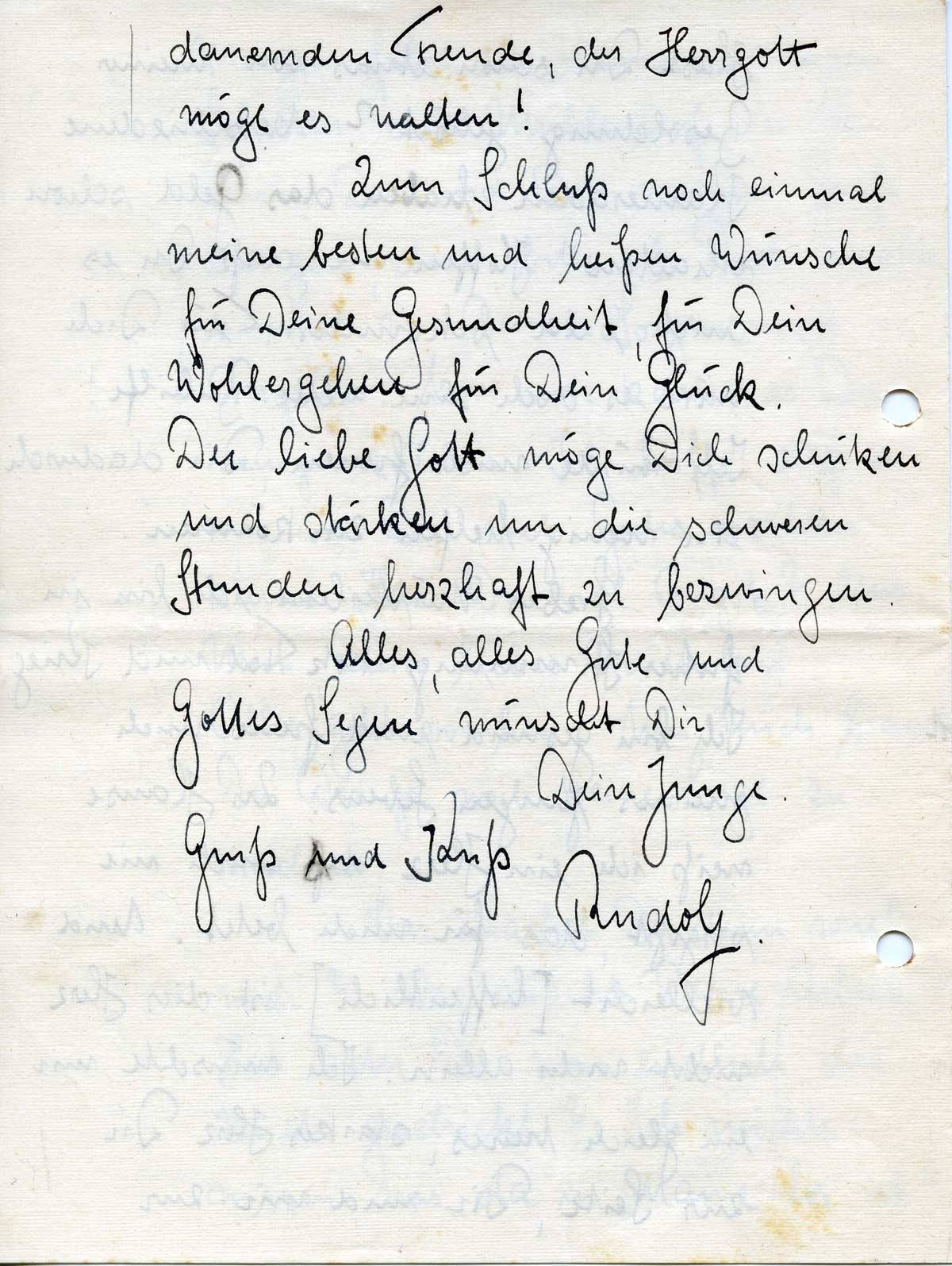 Zum Schluß noch einmal meine besten und heißen Wünsche für Deine Gesundheit, für Dein Wohlergehen für Dein Glück. Der liebe Gott möge Dich schützen und stärken um die schweren Stunden herzhaft zu bezwingen.