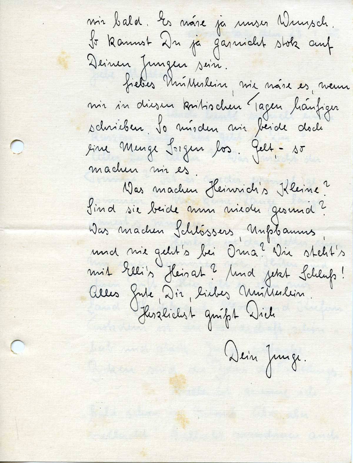 Liebes Mütterlein, wie wäre es, wenn wir in diesen kritischen Tagen häufiger schrieben. So würden wir beide doch eine Menge Sorgen los. Gelt, - so machen wir es.