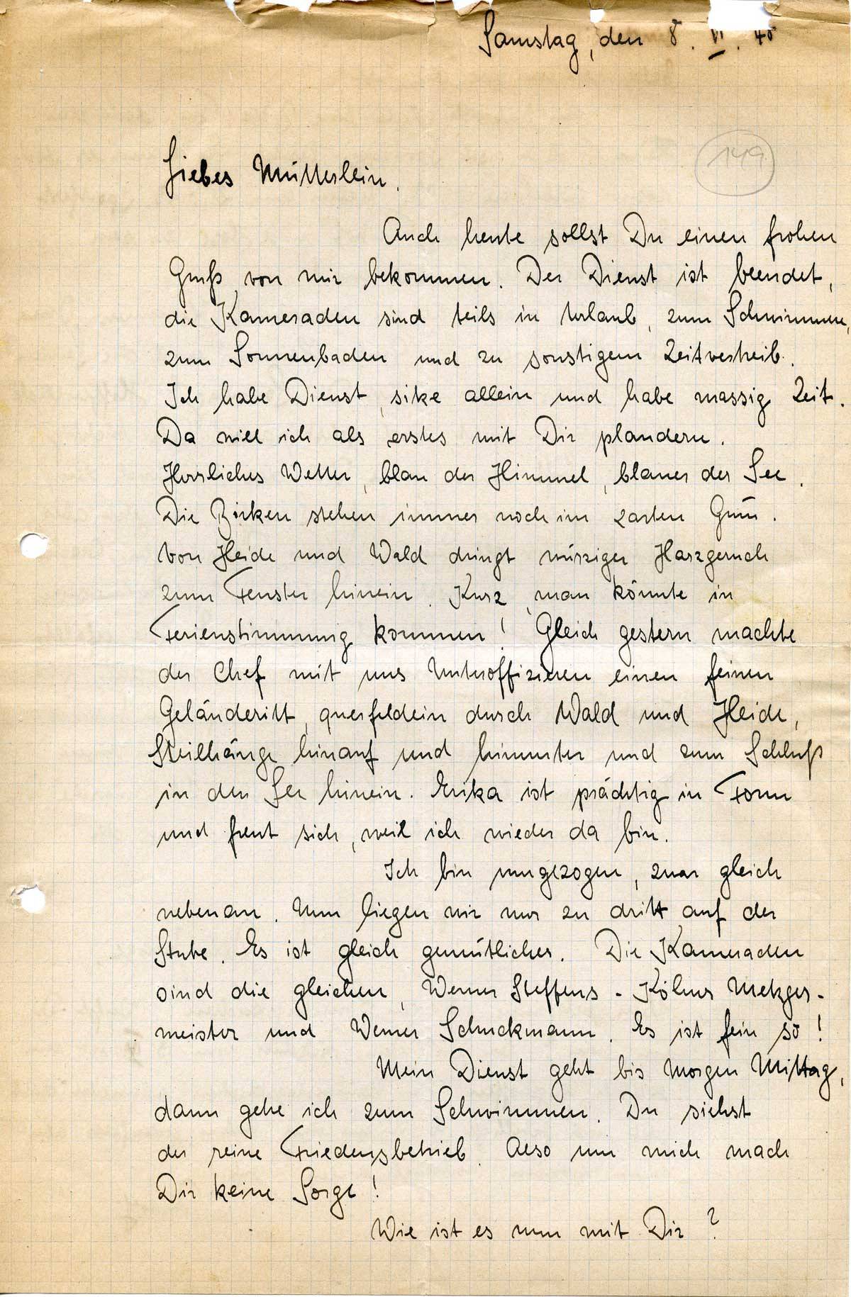 Auch heute sollst Du einen frohen Gruß von mir bekommen. Der Dienst ist beendet, die Kameraden sind teils in Urlaub, zum Schwimmen, zum Sonnenbaden und zu sonstigem Zeitvertreib. Ich habe Dienst, sitze allein und habe massig Zeit. Da will ich als erstes mir Dir plaudern.