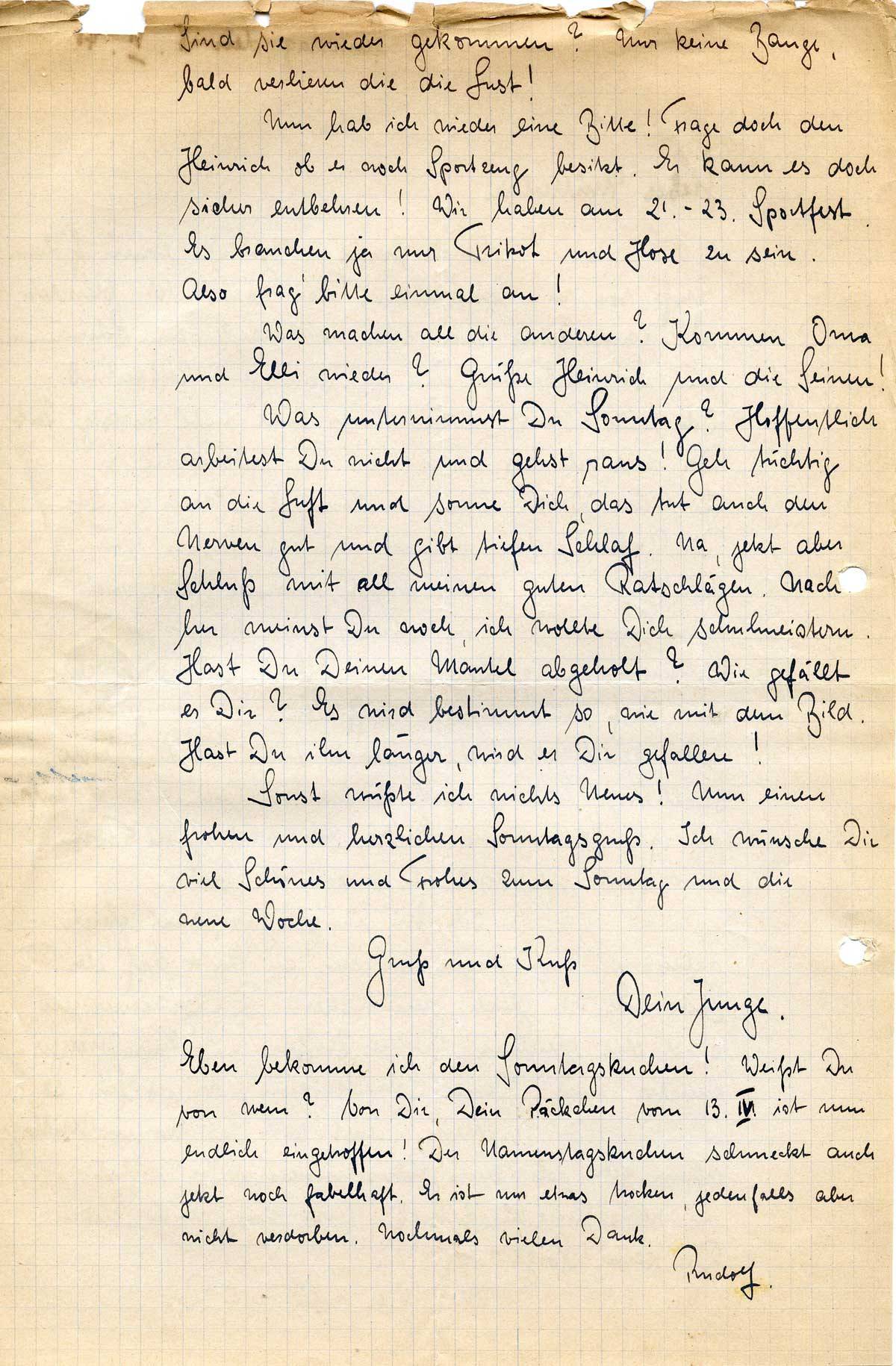 Eben bekomme ich den Sonntagskuchen! Weißt Du von wem? Von Dir, Dein Päckchen vom 13.IV. ist nun endlich eingetroffen! Der Namenstagskuchen schmeckt auch jetzt noch fabelhaft. Er ist nur etwas trocken, jedenfalls aber nicht verdorben. Nochmals vielen Dank.