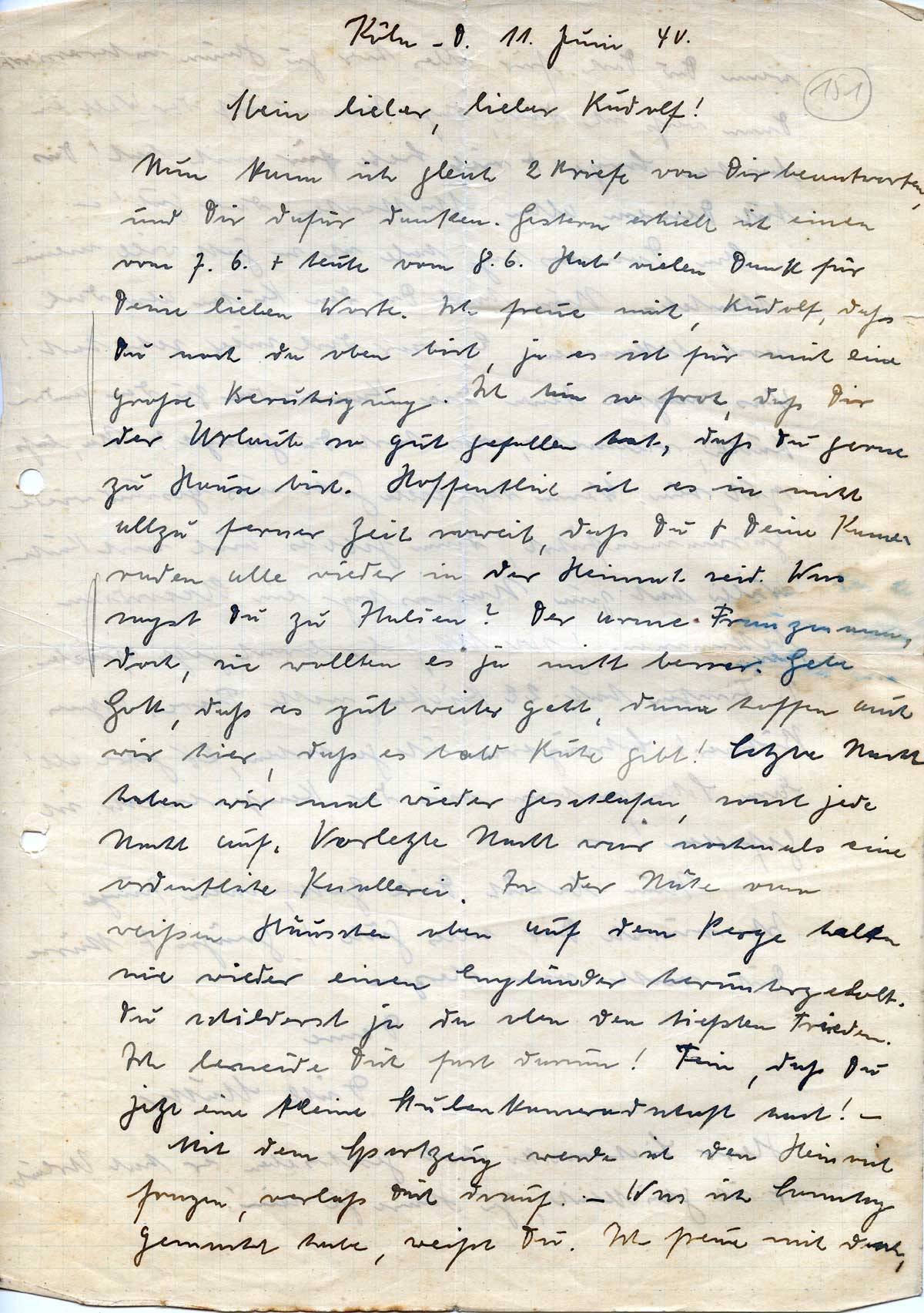Nun kann ich gleich 2 Briefe von Dir beantworten, und Dir dafür danken. Gestern erhielt ich einen vom 7.6. + heute vom 8.6. Hab‘ vielen Dank für Deine lieben Worte. Ich freue mich, Rudolf, daß Du noch da oben bist, ja es ist für mich eine große Beruhigung. Ich bin so froh, daß Dir der Urlaub so gut gefallen hat, daß Du gerne zu Hause bist. Hoffentlich ist es in nicht allzu ferner Zeit soweit, daß Du + Deine Kameraden alle wieder in der Heimat seid. Was sagst Du zu Italien? Der arme Franzmann, doch sie wollten es ja nicht besser. Gebe Gott, daß es gut weiter geht, dann hoffen auch wir hier, daß es bald Ruhe gibt! Letzte Nacht haben wir mal wieder geschlafen, sonst jede Nacht auf. Vorletzte Nacht war nochmals eine ordentliche Knallerei. In der Nähe vom weißen Häuschen oben auf dem Berge haben sie wieder einen Engländer heruntergeholt. Du schilderst ja da oben den tiefsten Frieden. Ich beneide Dich fast darum! Fein, daß Du jetzt eine kleine Stubenkameradschaft hast! –