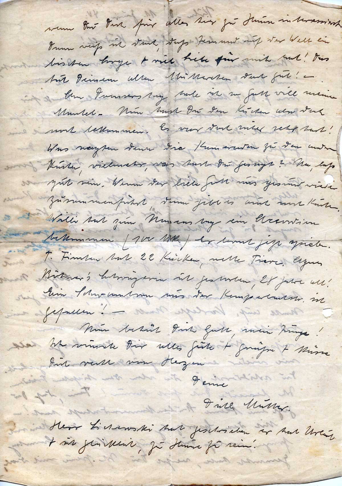 Am Donnerstag hole ich so Gott will meinen Mantel. – Nun hast Du den Kuchen also doch noch bekommen. Er war doch sicher sehr hart! Was sagten denn die Kameraden zu den anderen Kuchen, vielmehr, was hast Du gesagt? Na, laß gut sein. Wenn der liebe Gott uns gesund wieder zusammenführt, dann gibt es auch noch Kuchen. Willi hat zum Namenstag ein Accordion bekommen (100 Mk.) Er lernt jetzt spielen. T. Finchen hat 22 Kücken, nette Tiere. Agnes Böhner’s Schwägerin ist gestorben, 28 Jahre alt! Ein Schwamborn[?] aus der Kemperbachstr. ist gefallen! –