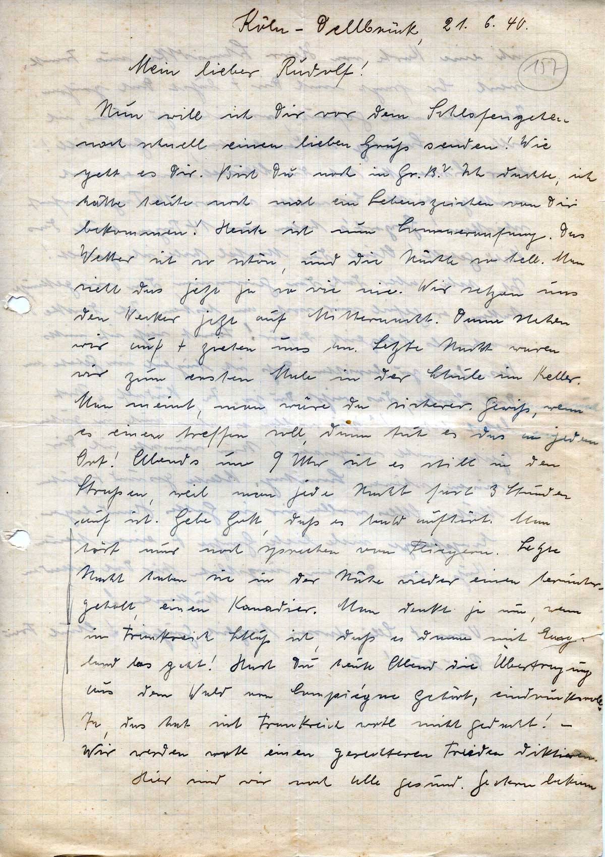 Vorerst möchte ich Dich nach Deinem Befinden fragen. Liebes Mütterlein, wie geht es Dir? Bist Du noch gesund und hast Du guten Mut? Wir haben gehört, daß Ihr in Köln fleißig Besuch bekommt. Ich bete, daß der Herrgott Dich schützt und Dir Mut gibt. Sei nicht zu ängstlich, bald kommen die nicht mehr!