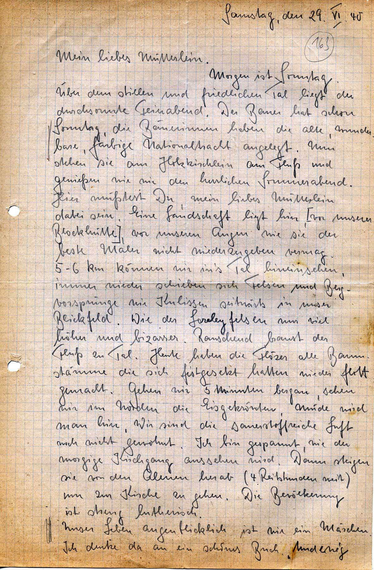 Morgen ist Sonntag. Über dem stillen und friedlichen Tal liegt der durchsonnte Feierabend. Der Bauer hat schon Sonntag, die Bäuerinnen haben die alte, wunderbare, farbige Nationaltracht angelegt. Nun stehen sie am Holzkirchlein am Fluß und genießen wie wir den herrlichen Sommerabend. Hier müßtest Du, mein liebes Mütterlein dabei sein. Eine Landschaft liegt hier, [vor unserer Blockhütte], vor unseren Augen wie sie der beste Maler nicht wiederzugeben vermag. 5-6 km können wir in’s Tal hineinsehen, immer wieder schieben sich Felsen und Bergvorsprünge wie Kulissen seitwärts in unser Blickfeld. Wie der Loreleyfelsen nur viel höher und bizarrer. Rauschend braust der Fluß zu Tal. Heute haben die Flöser alle Baumstämme die sich festgesetzt hatten wieder flott gemacht. Gehen wir 5 Minuten bergan, sehen wir im Norden die Eisgekrönten. Müde wird man hier. Wir sind die sauerstoffreiche Luft noch nicht gewohnt. Ich bin gespannt, wie der morgige Kirchgang aussehen wird. Dann steigen sie von den Almen herab (4 Reitstunden weit) um zur Kirche zu gehen. Die Bevölkerung ist streng lutherisch.