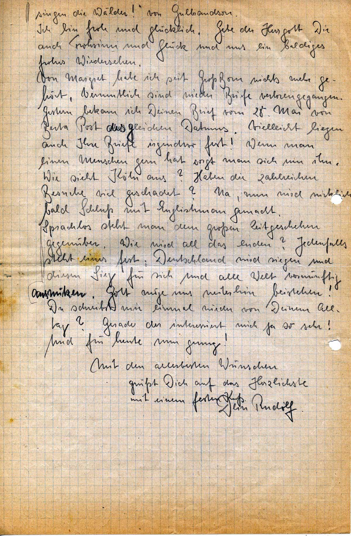 Von Margret habe ich seit Groß Born nichts mehr gehört. Vermutlich sind wieder Briefe verlorengegangen. Gestern bekam ich Deinen Brief vom 28. Mai von Berta Post des gleichen Datums. Vielleicht liegen auch Ihre Briefe irgendwo fest! Wenn man einen Menschen gern hat sorgt man sich um ihn. Wie sieht Köln aus? Haben die zahlreichen Besuche viel geschadet? Na, nun wird wirklich bald Schluß mit Englishman gemacht.