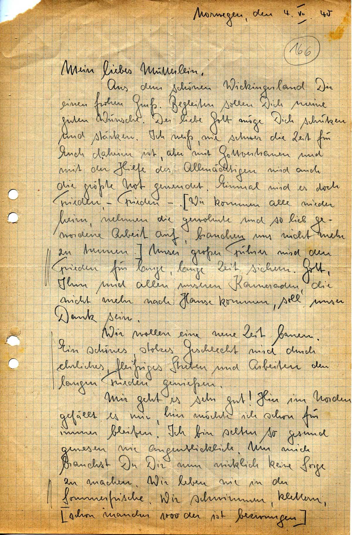 Aus dem schönen Wickingerland Dir einen frohen Gruß. Begleiten sollen Dich meine guten Wünsche. Der liebe Gott möge Dich schützen und stärken. Ich weiß, wie schwer die Zeit für Euch daheim ist, aber mit Gottvertrauen und mit der Hilfe des Allmächtigen wird auch die größte Not gewendet. Einmal wird es doch Frieden, - Frieden -. [Wir kommen alle wieder heim, nehmen die gewohnte und so lieb gewonnene Arbeit auf, brauchen uns nicht mehr zu trennen.] Unser großer Führer wird den Frieden für lange, lange Zeit sichern. Gott, Ihm und allen unseren Kameraden, die nicht mehr nach Hause kommen, soll unser Dank sein.