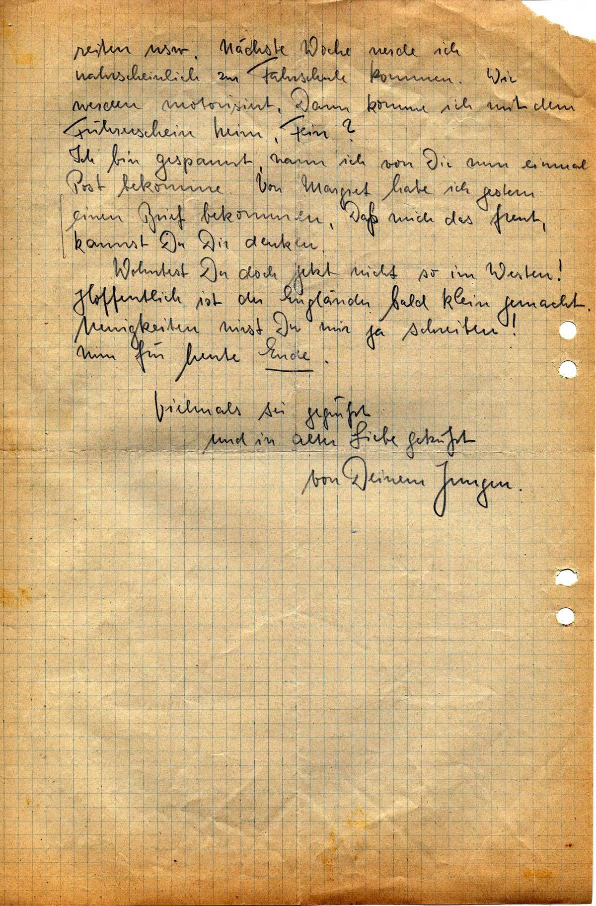 Ich bin gespannt, wann ich von Dir nun einmal Post bekomme. Von Margret habe ich gestern einen Brief bekommen. Daß mich das freut, kannst Du Dir denken.
