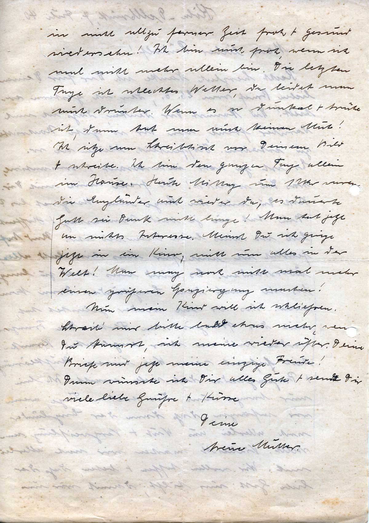 Nun mein Kind will ich schließen. Schreib‘ mir bitte bald etwas mehr, wenn Du kannst, ich meine wieder öfter. Deine Briefe sind jetzt meine einzige Freude!