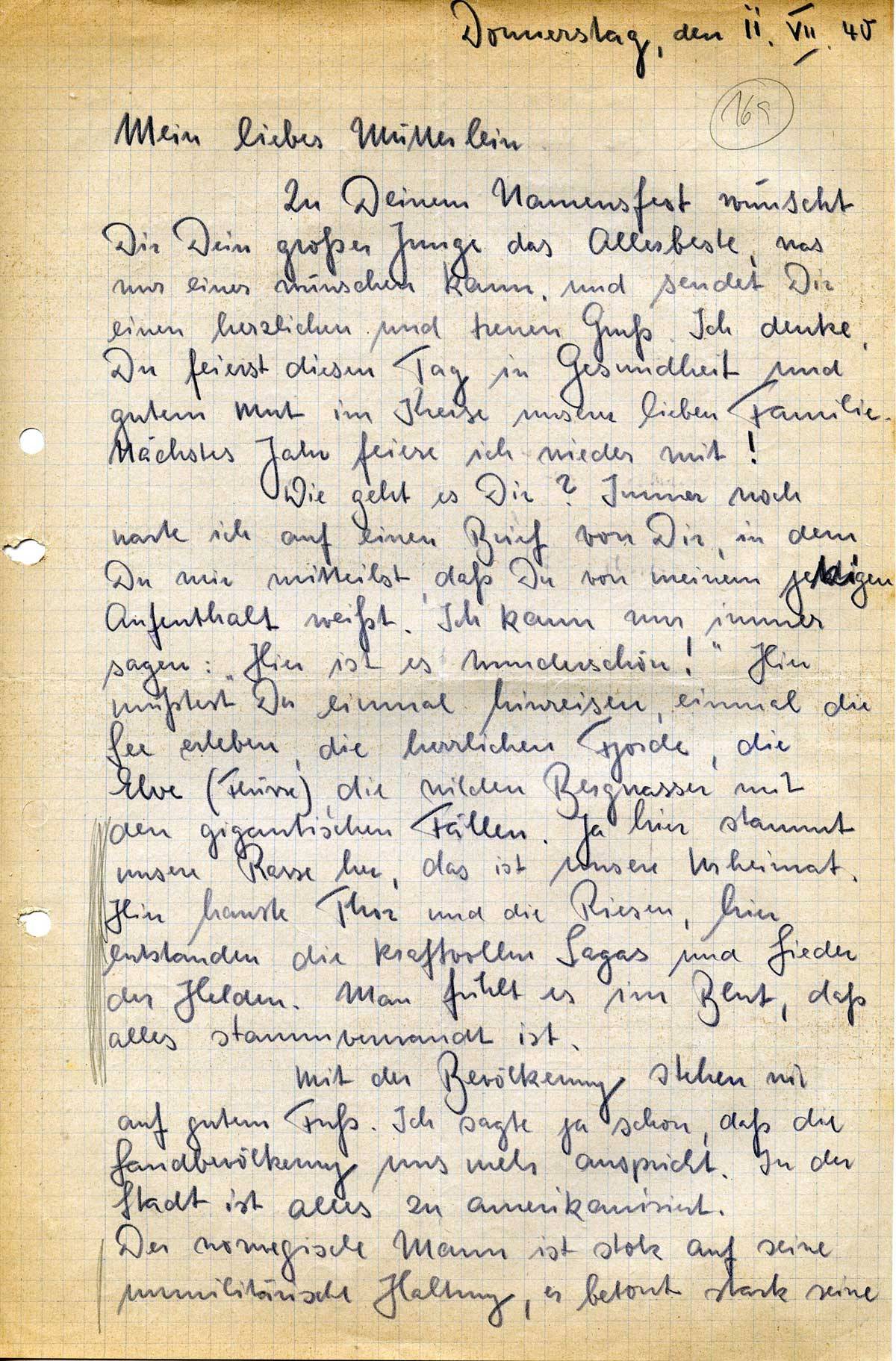 Wie geht es Dir? Immer noch warte ich auf einen Brief von Dir, in dem Du mir mitteilst, daß Du von meinem jetzigen Aufenthalt weißt. Ich kann nur immer sagen: „Hier ist es wunderschön!“ Hier müßtest Du einmal hinreisen, einmal die See erleben, die herrlichen Fjorde, die Elve (Flüsse), die wilden Bergmassen[?] mit den gigantischen Fällen. Ja hier stammt unsere Rasse her, das ist unsere Urheimat. Hier hauste Thor und die Riesen, hier entstanden die kraftvollen Sagas und Lieder der Helden. Man fühlt es im Blut, daß alles stammverwandt ist.