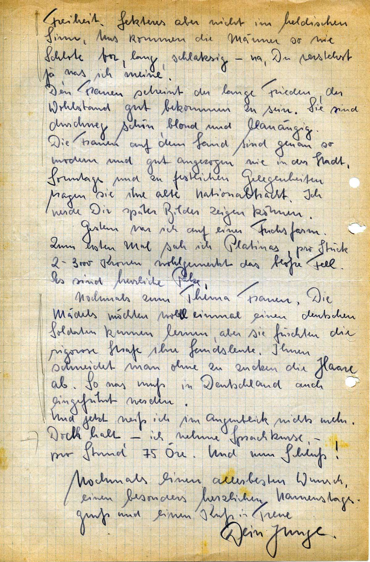 Den Frauen scheint der lange Frieden, der Wohlstand gut bekommen zu sein. Sie sind durchweg schön, blond und blauäugig. Die Frauen auf dem Land sind genau so modern und gut angezogen wie in der Stadt. Sonntags und zu festlichen Gelegenheiten tragen sie ihre alte Nationaltracht. Ich werde Dir später Bilder zeigen können.