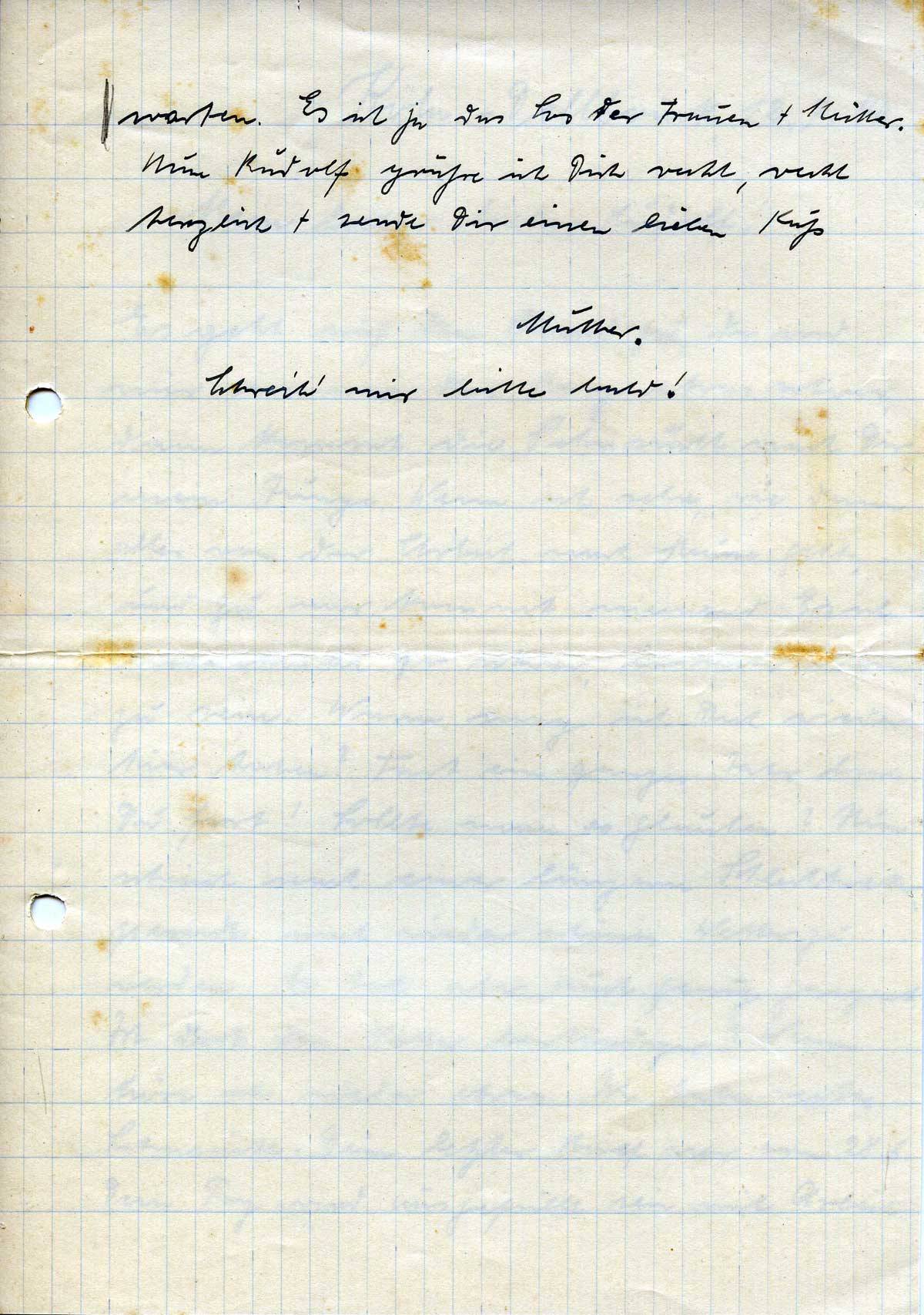 Ich müßte jetzt nur mal eine Viertelstunde mit Dir plaudern. Du fehlst mir doch so sehr, mein Rudolf! Aber ich bin es ja nicht allein, und ich kann Dir noch schreiben. Andere Mütter haben schon das allerschwerste Opfer bringen müssen. Das ist furchtbar, und sehr schwer zu tragen. Nun hoffe ich, morgen von Dir zu hören, sonst muß ich weiter