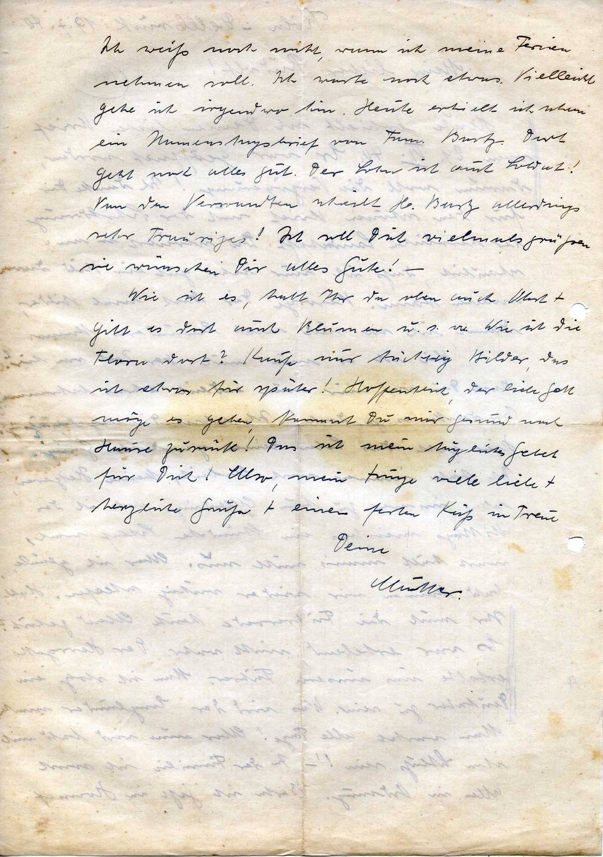 Ich weiß noch nicht, wann ich meine Ferien nehmen soll. Ich warte noch etwas. Vielleicht gehe ich irgendwo hin. Heute erhielt ich schon ein Namenstagsbrief von Fam. Bartz. Dort geht noch alles gut. Der Sohn ist auch Soldat! Von den Verwandten schreibt H. Bartz allerdings sehr Trauriges! Ich soll Dich vielmals grüßen sie wünschen Dir alles Gute! –
