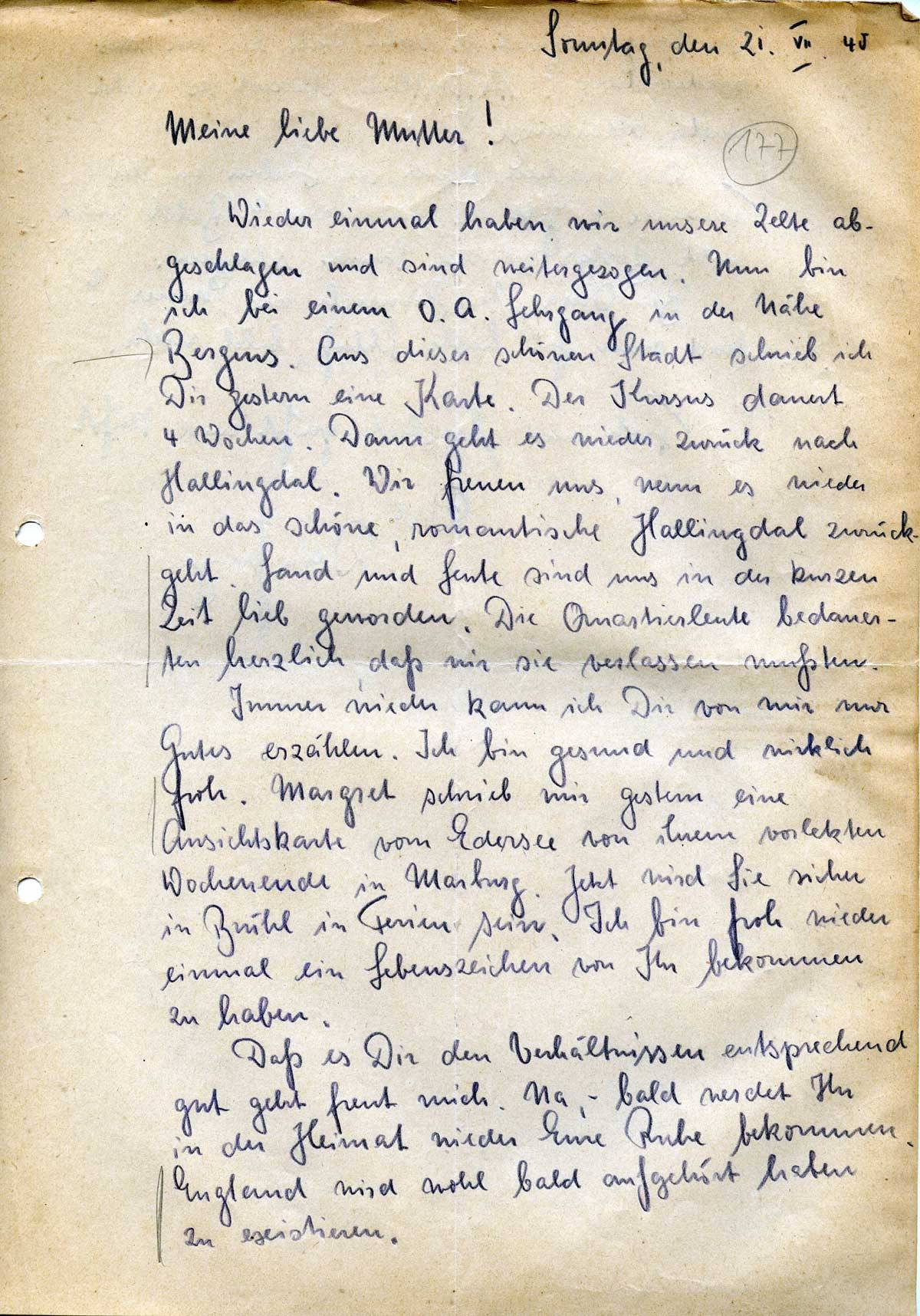 Wieder einmal haben wir unsere Zelte abgeschlagen und sind weitergezogen. Nun bin ich bei einem O.A. Lehrgang in der Nähe Bergens. Aus dieser schönen Stadt schrieb ich Dir gestern eine Karte. Der Kursus dauert 4 Wochen. Dann geht es wieder zurück nach Hallingdal. Wir freuen uns, wenn es wieder in das schöne, romantische Hallingdal zurückgeht. Land und Leute sind uns in der kurzen Zeit lieb geworden. Die Quartierleute bedauerten herzlich, daß wir sie verlassen mußten.