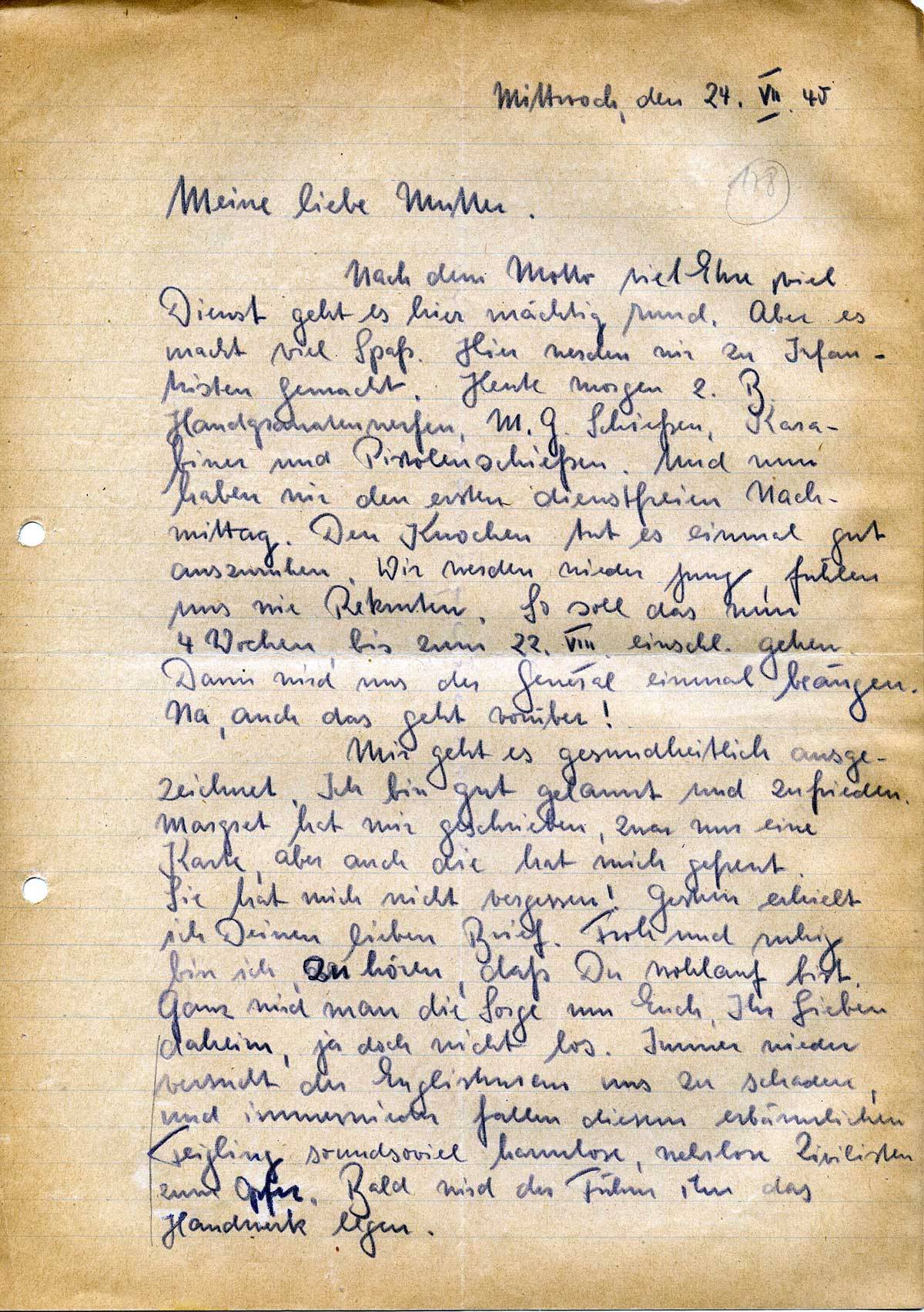 Nach dem Motto viel Ehre viel Dienst geht es hier mächtig rund. Aber es macht viel Spaß. Hier werden wir zu Infantristen gemacht. Heute morgen z. B. Handgranatenwerfen, M.G. Schießen, Karabiner und Pistolenschießen. Und nun haben wir den ersten dienstfreien Nachmittag. Den Knochen tut es einmal gut auszuruhen. Wir werden wieder jung, fühlen uns wie Rekruten. So soll das nun 4 Wochen, bis zum 22.VIII. einschl. gehen. Dann wird uns der General einmal beäugen. Na, auch das geht vorüber!