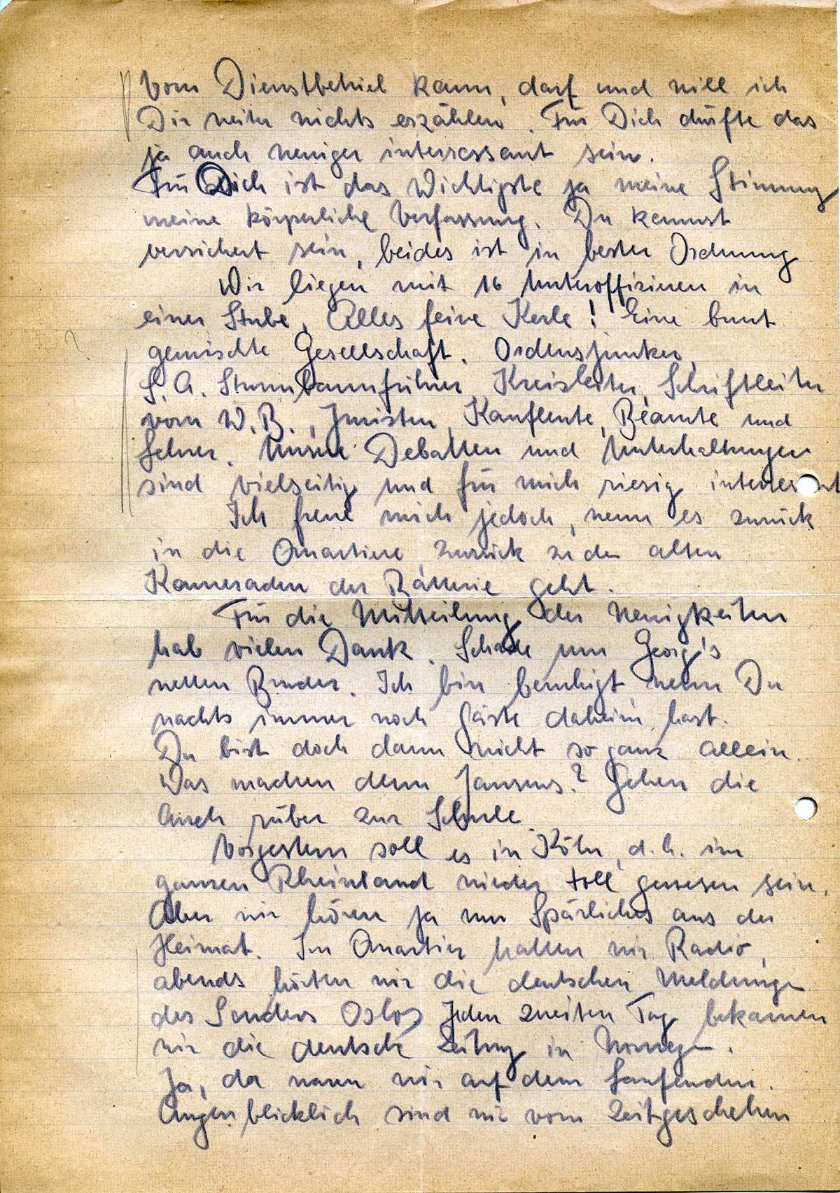 Wir liegen mit 16 Unteroffizieren in einer Stube. Alles feine Kerle! Eine bunt gemischte Gesellschaft. Ordensjunker, S.A. Sturmbannführer, Kreisleiter, Schriftleiter vom W.B., Juristen, Kaufleute, Beamte und Lehrer. Unsere Debatten und Unterhaltungen sind vielseitig und für mich riesig interessant.