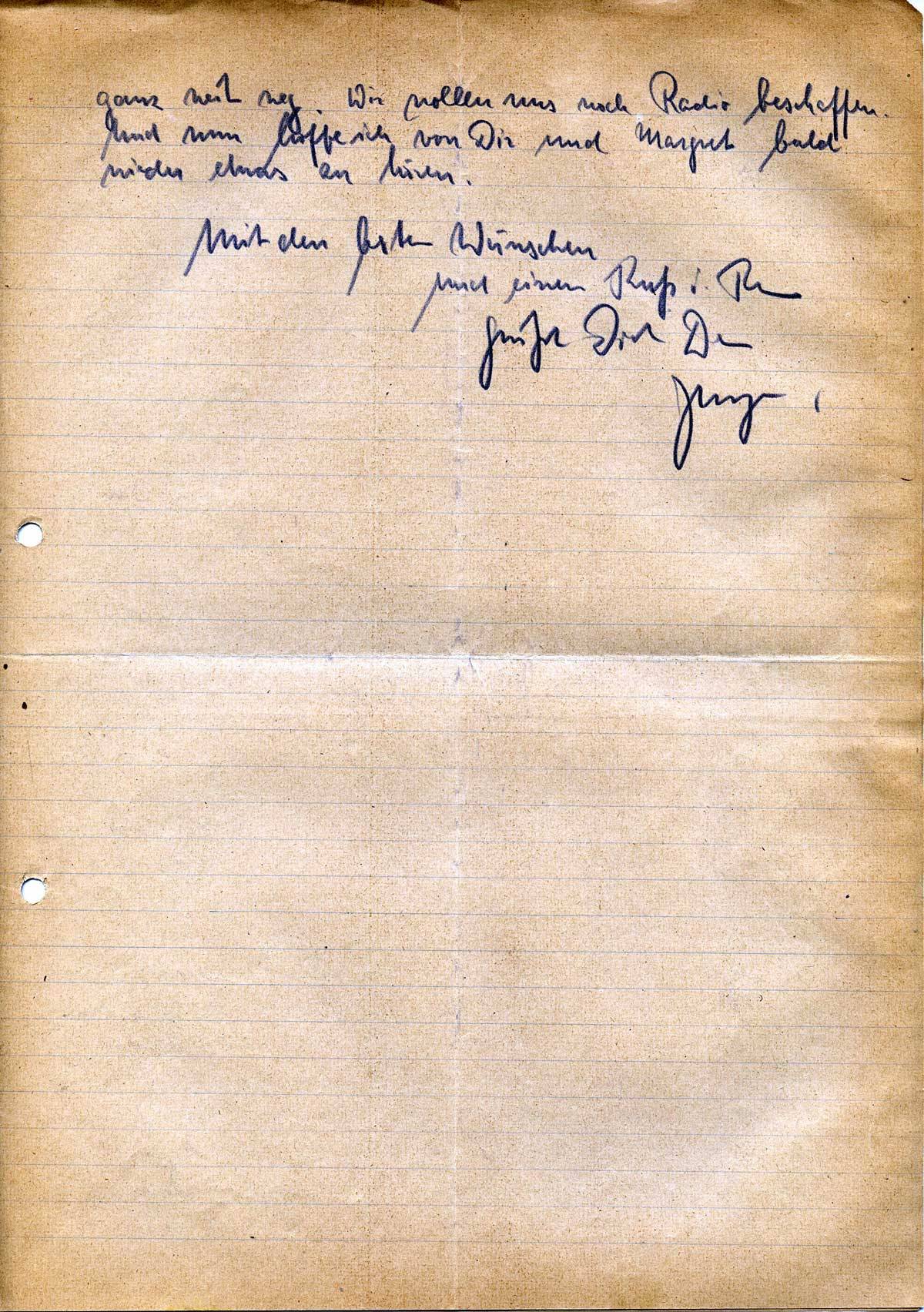 Für die Mitteilung der Neuigkeiten hab vielen Dank. Schade um Georg’s netten Bruder. Ich bin beruhigt, wenn Du nachts immer noch Gäste daheim hast. Du bist doch dann nicht so ganz allein. Was machen denn Jansens? Gehen die auch rüber zur Schule.