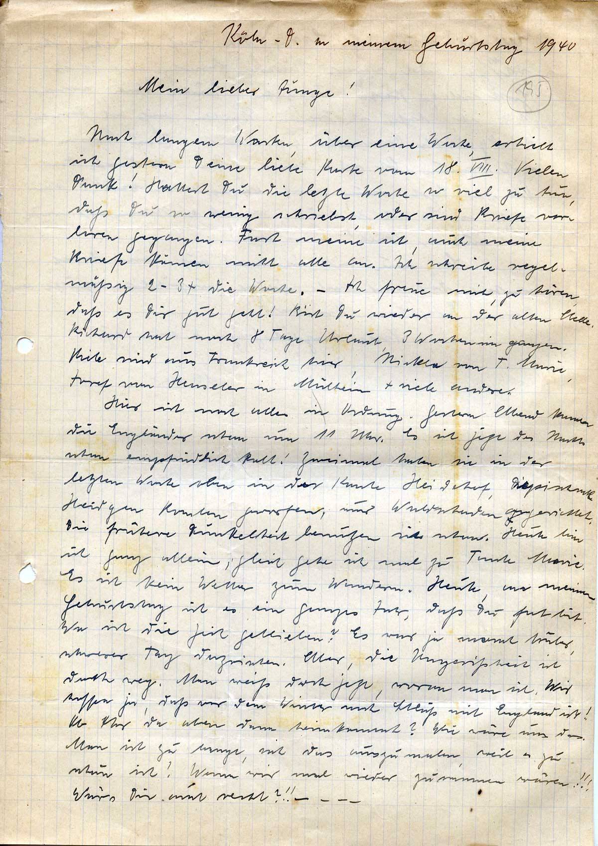 Hier ist noch alles in Ordnung. Gestern Abend kamen die Engländer schon um 11 Uhr. Es ist jetzt des Nachts schon empfindlich kalt! Zweimal haben sie in der letzten Woche oben in der Kante Heidehof, [..], Heidgen Bomben geworfen, nur Waldschaden angerichtet. Die frühere Dunkelheit benutzen sie schon. Heute bin ich ganz allein; gleich gehe ich mal zu Tante Mrie. Es ist kein Wetter zum Wandern. Heute, an meinem Geburtstag ist es ein ganzes Jahr, daß Du fort bist. Wo ist die Zeit geblieben? Es war ja manch trüber, schwerer Tag dazwischen. Aber, die Ungewißheit ist doch weg. Man weiß doch jetzt, woran man ist. Wir hoffen ja, daß vor dem Winter noch Schluß mit England ist! Ob Ihr da oben dann heimkommt? Wie wäre uns das. Man ist zu bange, sich das auszumalen, weil es ja schön ist! Wenn wir mal wieder zusammen wären!!! Wär’s Dir auch recht?!! ----