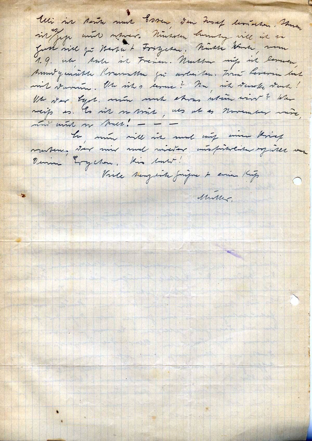 Elli ist heute nach Essen, den Josef besuchen. Ihnen ist es jetzt auch schwer. Nächsten Sonntag will ich so Gott will zu Berta + Fritzchen. Nächste Woche, vom 1.9. ab, habe ich Ferien. Nachher muß ich lernen, handgenähte Krawatten zu arbeiten. Frau Severin bat mich darum. Ob ich’s lerne? Na, ich denke doch! Ob der Sept. nun noch etwas schön wird? Wer weiß es. Es ist so trüb, als ob es November wäre, und auch so kalt! ---