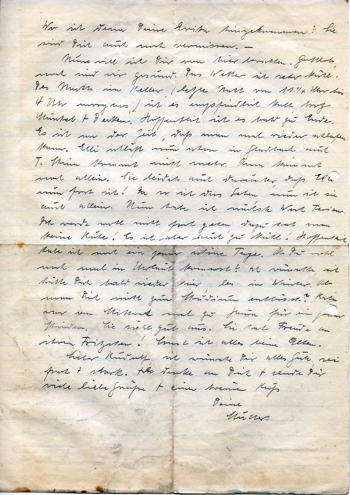 Nun will ich Dir von hier berichten. Gottlob, noch sind wir gesund. Das Wetter ist sehr kühl. Des Nachts im Keller, (letzte Nacht von 11 ¼ Uhr bis 4 Uhr morgens,) ist es empfindlich kalt, trotz Mäntel + Decken. Hoffentlich ist es bald zu Ende. Es ist an der Zeit, daß man mal wieder schlafen kann. Elli schläft nun schon in Gladbach, auch T. Stina kommt nicht mehr. Oma kommt noch allein. Sie leidet auch darunter, daß Elli nun fort ist! Ja so ist das Leben, nun ist sie auch allein. Nun habe ich nächste Woche Ferien. Ich werde wohl nicht fort gehen, dazu hat man keine Ruhe! Es ist aber auch zu kühl! Hoffentlich habe ich noch ein paar schöne Tage. Ob Du wohl noch mal in Urlaub kommst? Ich wünschte, ich hätte Dich bald wieder hier, bes. im Winter. Ob man Dich nicht zum Studium entlässt? Berta war am Mittwoch mal zu Hause für ein paar Stunden. Sie sieht gut aus. Sie hat Freude an ihrem Fritzchen! Sonst ist alles beim Alten.
