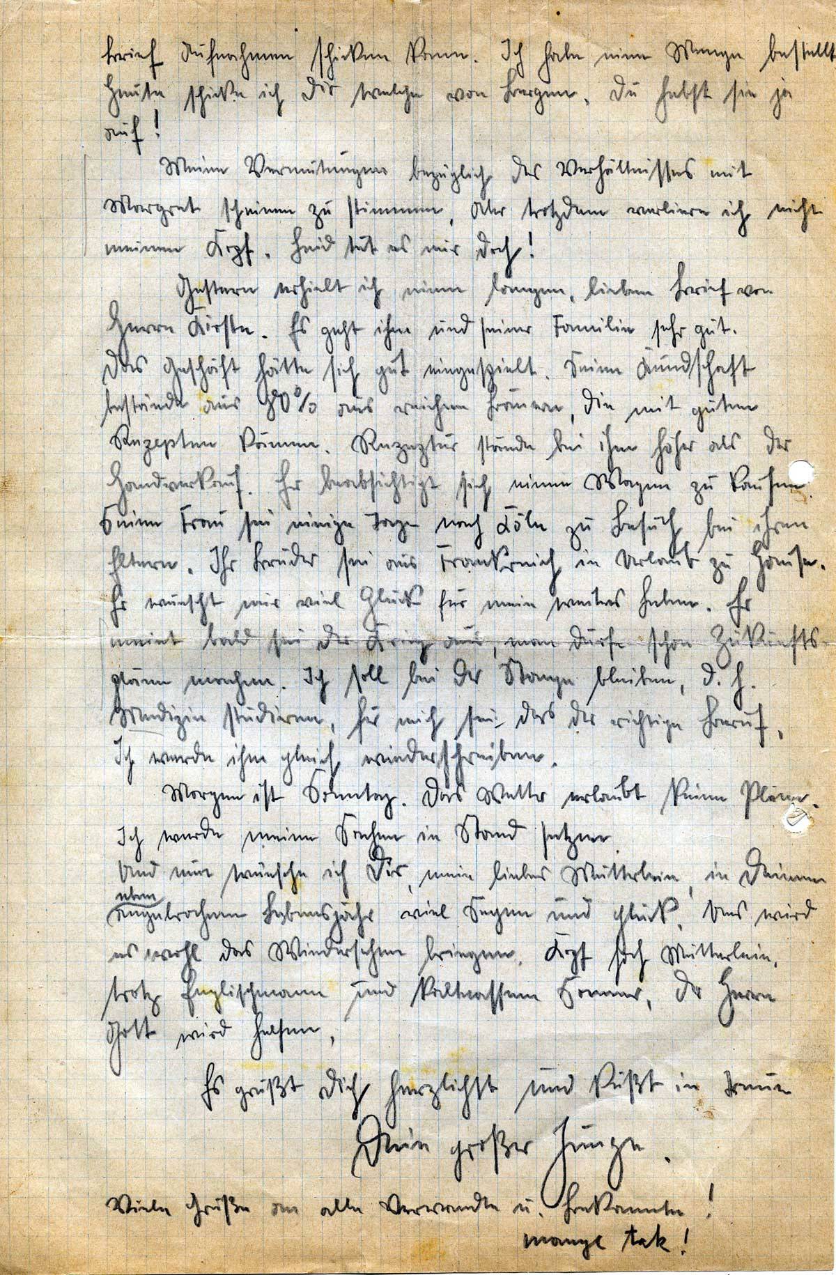 Und nun wünsche ich Dir, mein liebes Mütterlein, in Deinem eben angebrochenen Lebensjahre viel Segen und Glück. Uns wird es wohl das Wiedersehen bringen. Kopf hoch Mütterlein, trotz Englischmann und kaltnassem Sommer. Der Herr Gott wird helfen.