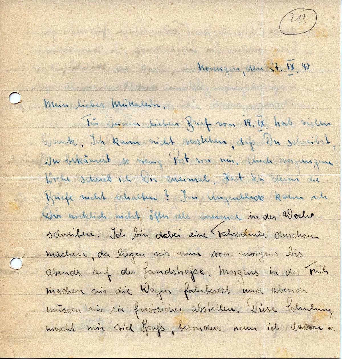 Für Deinen lieben Brief vom 19.IX. hab vielen Dank. Ich kann nicht verstehen, daß Du schreibst, Du bekämst so wenig Post von mir. Auch vergangene Woche schrieb ich Dir zweimal. Hast Du denn die Briefe nicht erhalten? Im Augenblick kann ich Dir wirklich nicht öfter als zweimal in der Woche schreiben. Ich bin dabei eine Fahrschule durchzumachen, da liegen wir nun von morgens bis abends auf der Landstraße. Morgens in der Früh machen wir die Wagen fahrbereit und abends müssen wir sie frostsicher abstellen. Diese Schulung macht mir viel Spaß, besonders wenn ich daran