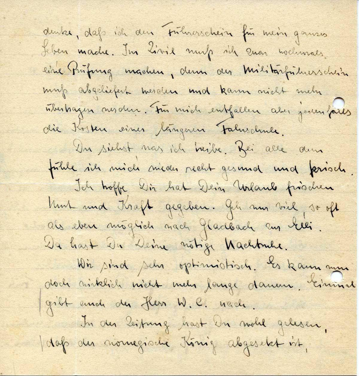 denke, daß ich den Führerschein für mein ganzes Leben mache. Im Zivil muß ich zwar nochmals eine Prüfung machen, denn der Militärführersein muß abgeliefert werden und kann nicht mehr übertragen werden. Für mich entfallen aber jedenfalls die Kosten einer längeren Fahrschule.