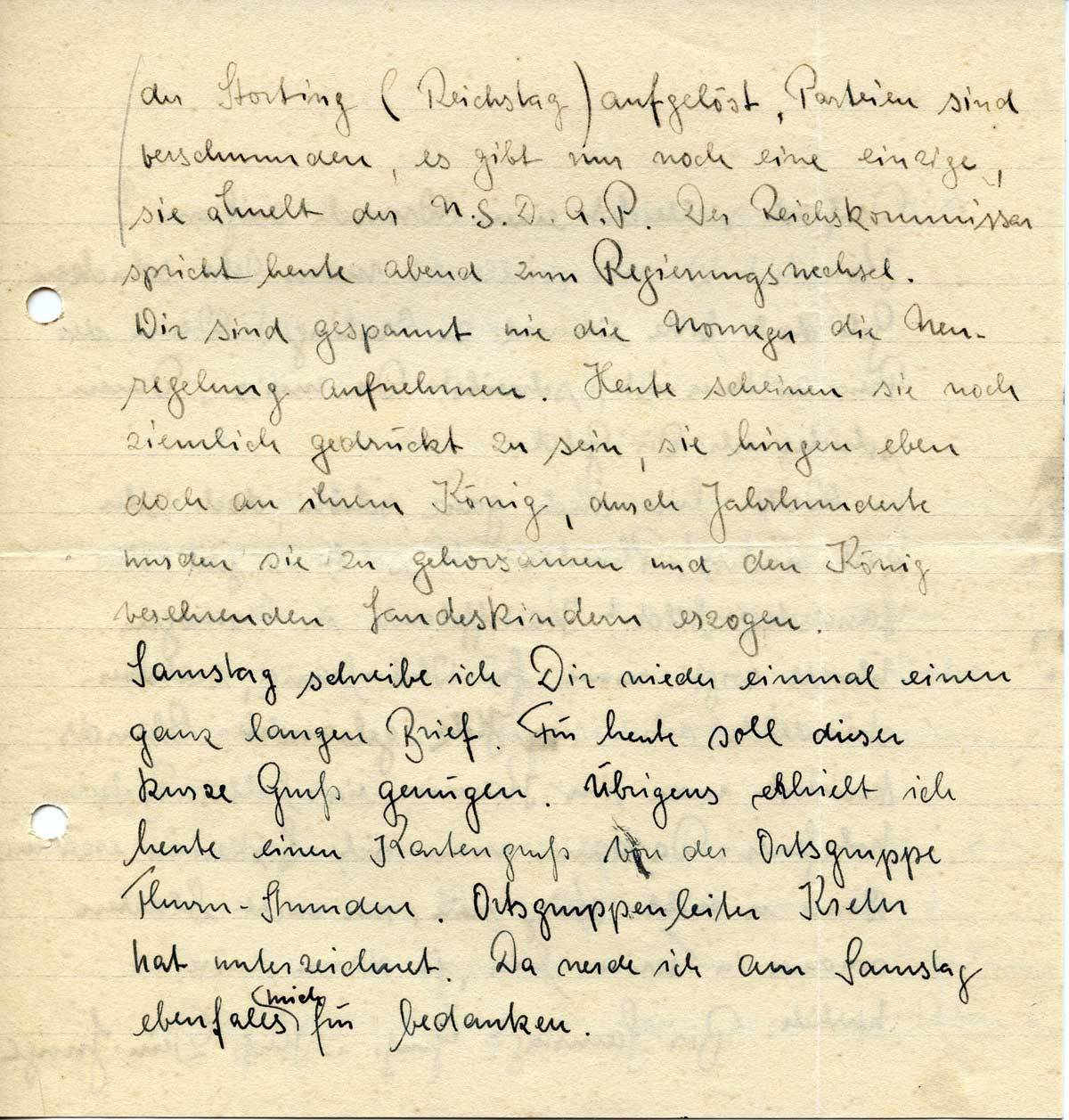 Samstag schreibe ich Dir wieder einmal einen ganz langen Brief. Für heute soll dieser kurze Gruß genügen. Übrigens erhielt ich heute einen Kartengruß von der Ortsgruppe [..]-Strunden. Ortsgruppenleiter Kreln hat unterzeichnet. Da werde ich am Samstag ebenfalls mich für bedanken.