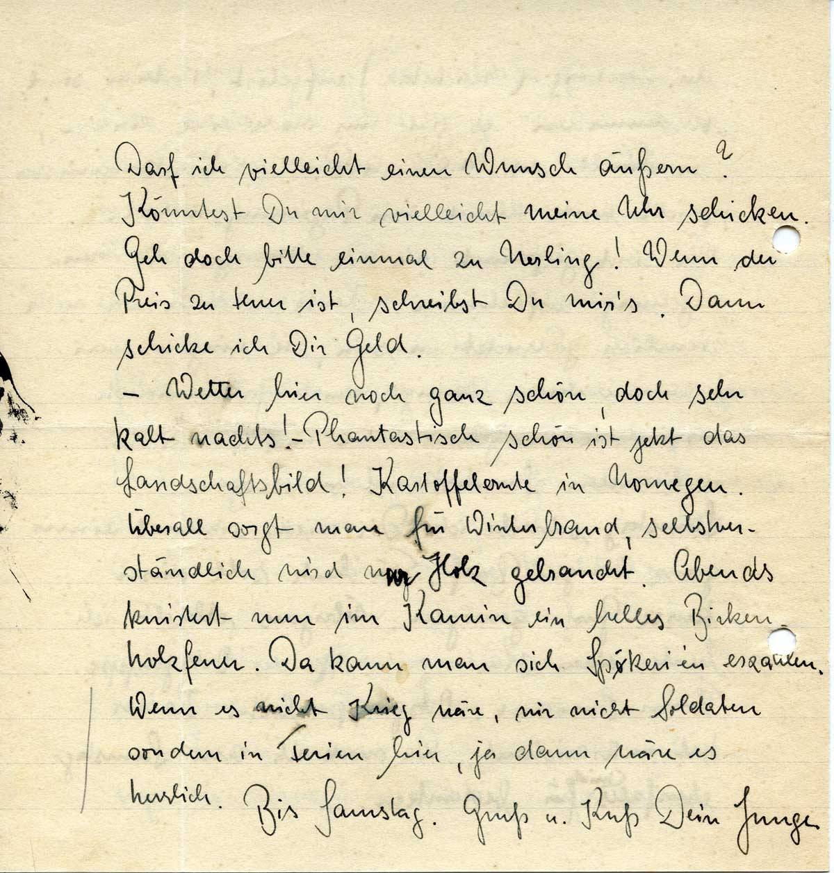 Darf ich vielleicht einen Wunsch äußern? Könntest Du mir vielleicht meine Uhr schicken. Geh doch bitte einmal zu Nerling! Wenn der Preis zu teuer ist, schreibst Du mir’s. Dann schicke ich Dir Geld.