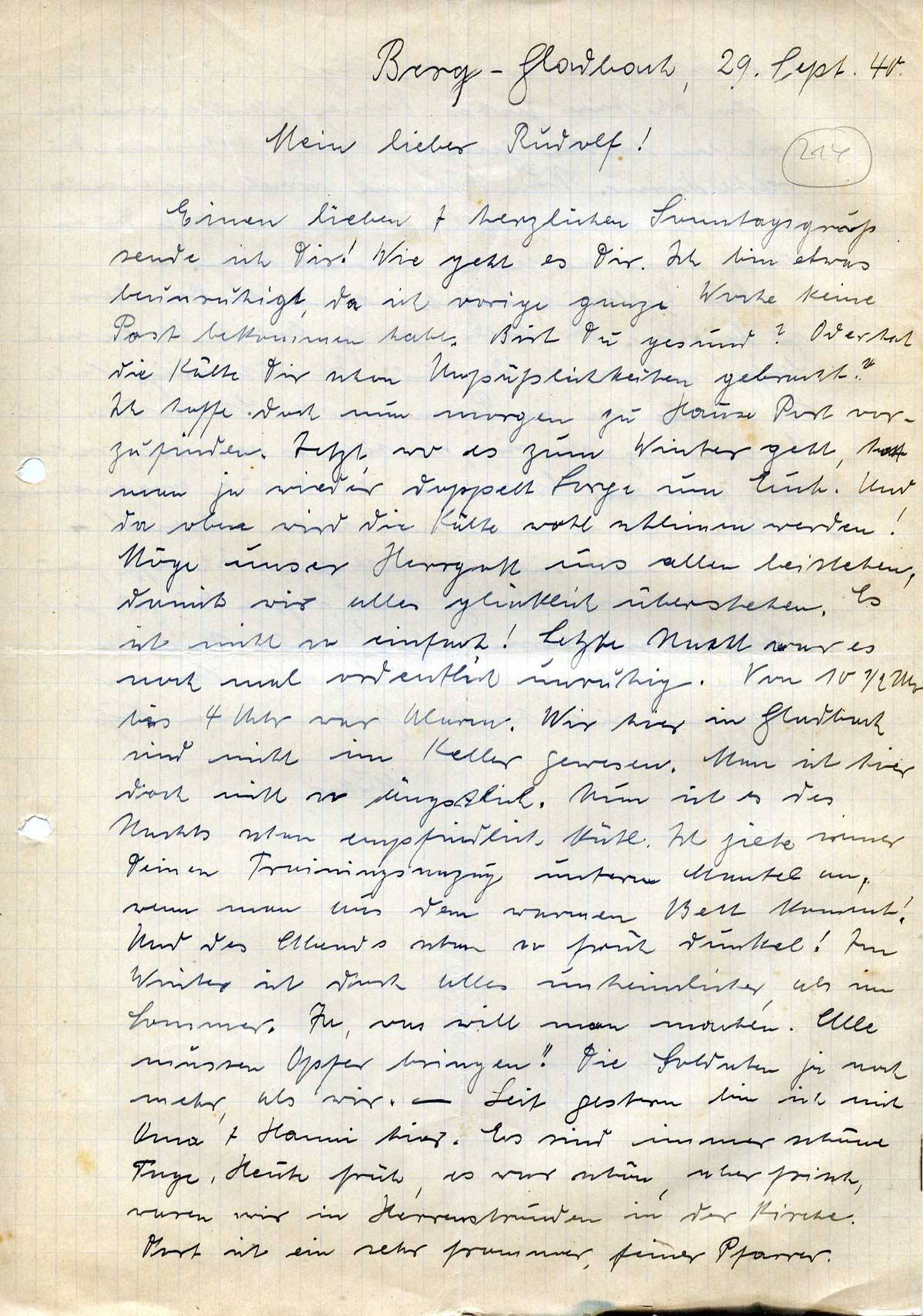 Einen lieben + herzlichen Sonntagsgruß sende ich Dir! Wie geht es Dir. Ich bin etwas beunruhigt, da ich vorige ganze Woche keine Post bekommen habe. Bist Du gesund? Oder hat die Kälte Dir schon Unpäßlichkeiten gebracht? Ich hoffe doch nun morgen zu Hause Post vorzufinden. Jetzt, wo es zum Winter geht, hat man ja wieder doppelt Sorge um Euch. Und da oben wird die Kälte wohl schlimm werden! Möge unser Herrgott uns allen beistehen, damit wir alles glücklich überstehen. Es ist nicht so einfach! Letzte Nacht war es noch mal ordentlich unruhig. Von 10 ½ Uhr bis 4 Uhr war Alarm. Wir hier in Gladbach sind nicht im Keller gewesen. Man ist hier doch nicht so ängstlich. Nun ist es des Nachts schon empfindlich kühl. Ich ziehe immer Deinen Trainingsanzug unterm Mantel an, wenn man aus dem warmen Bett kommt! Und des Abends schon so früh dunkel! Im Winter ist doch alles unheimlicher, als im Sommer. Ja, was will man machen. Alle müssen Opfer bringen! Die Soldaten ja noch mehr, als wir. – Seit gestern bin ich mit Oma + Hanni hier. Es sind immer schöne Tage. Heute früh, es war schön, aber frisch, waren wir in Herrenstrunden in der Kirche. Dort ist ein sehr frommer, feiner Pfarrer.