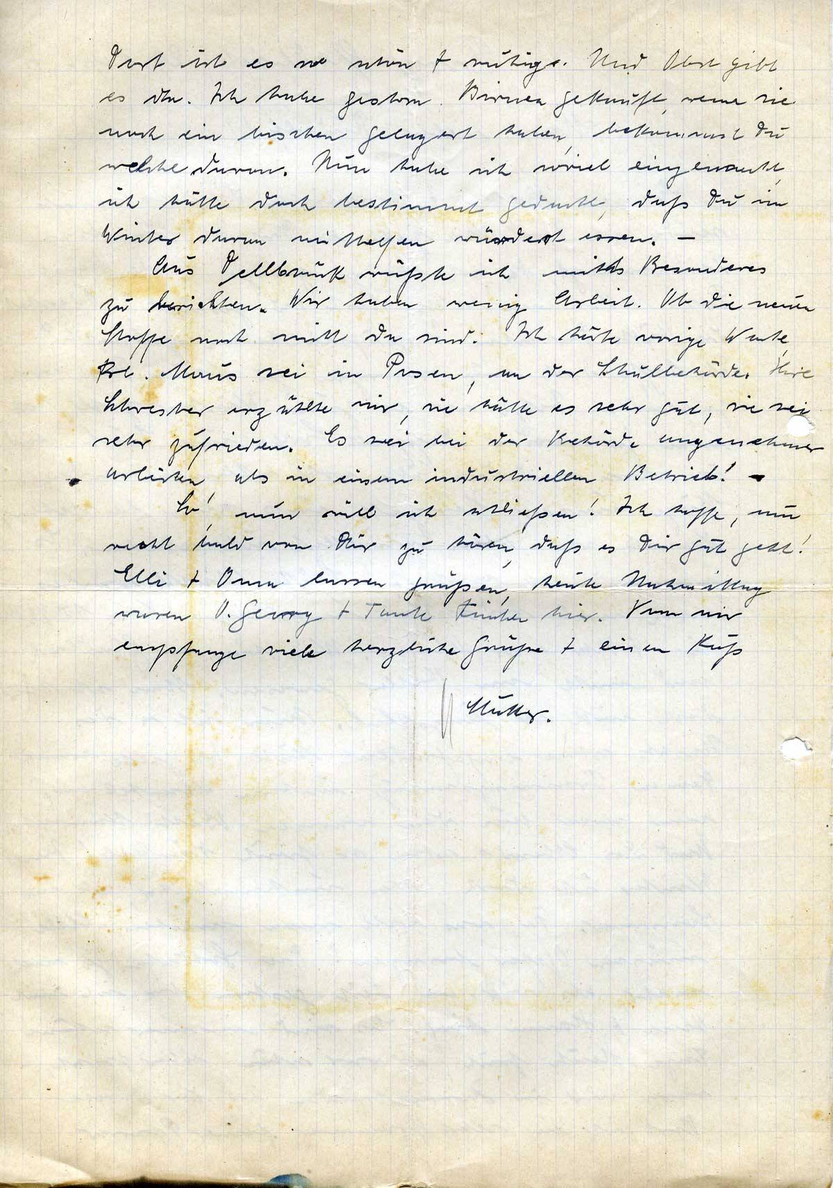 So, nun will ich schließen! Ich hoffe, nun recht bald von Dir zu hören, daß es Dir gut geht! Elli + Oma lassen grüßen, heute Nachmittag waren O. Georg + Tante Finchen hier. Von mir empfange viele herzliche Grüße + einen Kuß