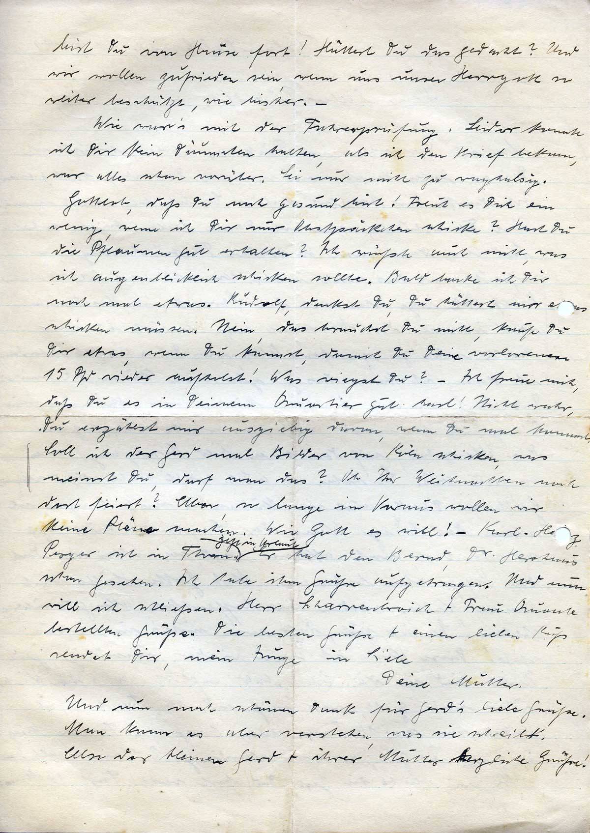 Gottlob, daß Du noch gesund bist! Freut es Dich ein wenig, wenn ich Dir nur Obstpäckchen schicke? Hast Du die Pflaumen gut erhalten? Ich wüßte auch nicht, was ich augenblicklich schicken sollte. Bald backe ich Dir noch mal etwas. Rudolf, denkst Du, Du hättest mir etwas schicken müssen. Nein, das brauchst Du nicht, kaufe Du Dir etwas, wenn Du kannst, damit Du Deine verlorenen 15 Pfd wieder aufholst! Was wiegst Du? – Ich freue mich, daß Du es in Deinem Quartier gut hast! Nicht wahr, Du erzählst mir ausgiebig davon, wenn Du mal kommst. Soll ich der Gerd mal Bilder von Köln schicken, was meinst Du, darf man das? Ob Ihr Weihnachten noch dort feiert? Aber, so lange im Voraus wollen wir keine Pläne machen. Wie Gott es will! – Karl-Heinz Perger ist in Thorn jetzt in Urlaub. Er hat den Bernd, Dr. Herrhaus schon gesehen. Ich habe ihm Grüße aufgetragen. Und nun will ich schließen. Herr Scharrenbroich + Frau Quante bestellen Grüße. Die besten Grüße + einen lieben Kuß sendet Dir, mein Junge in Liebe