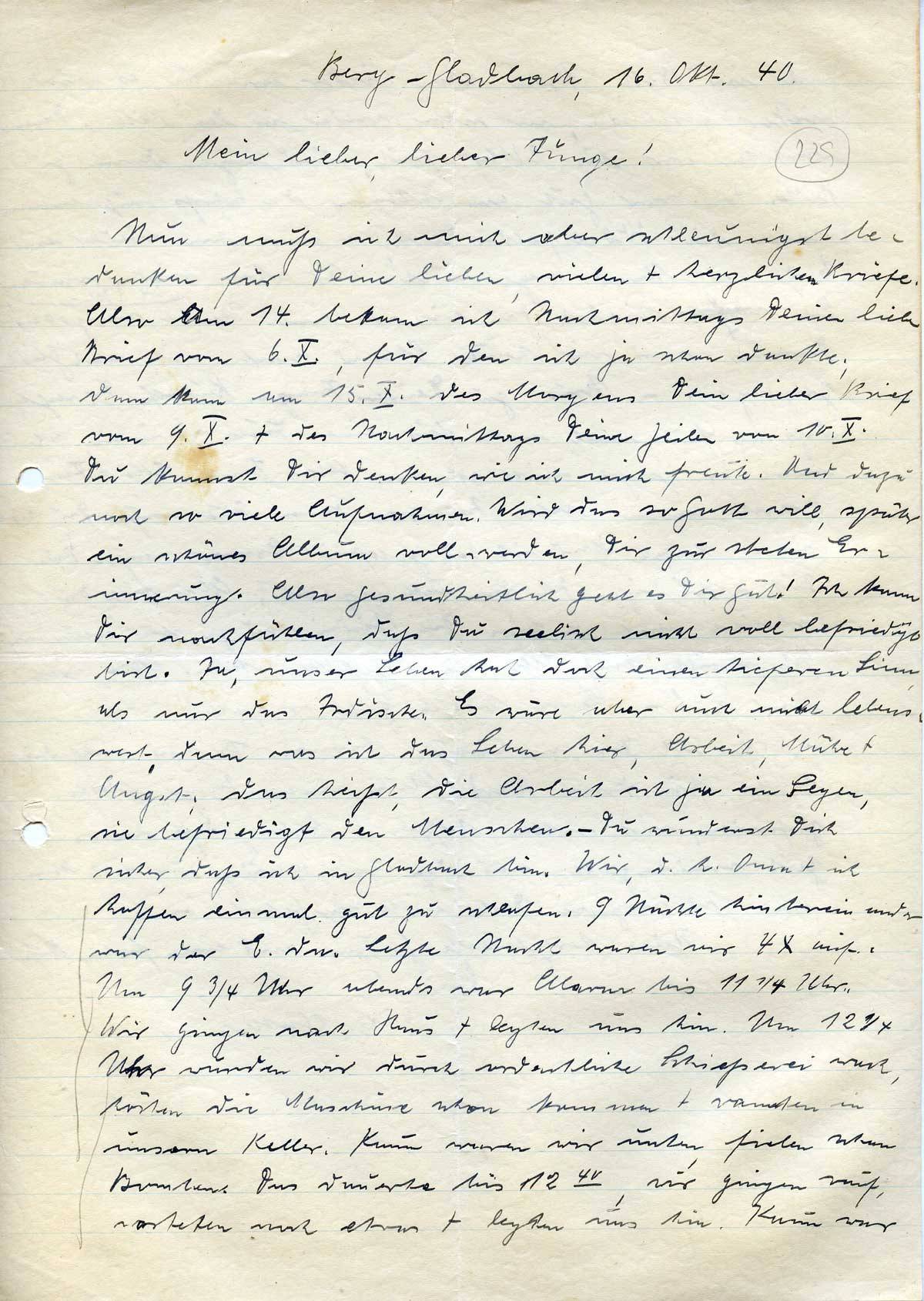 Nun muß ich mich aber schleunigst bedanken für Deine lieben, vielen + herzlichen Briefe. Also am 14. bekam ich Nachmittags Deinen lieben Brief vom 6.X., für den ich ja schon dankte; dann kam am 15.X. des Morgens Dein lieber Brief vom 9.X. + des Nachmittags Deine Zeilen vom 10.X. Du kannst Dir denken, wie ich mich freute. Und dazu noch so viele Aufnahmen. Wird das so Gott will, später ein schönes Album voll werden, Dir zur steten Erinnerung. Also gesundheitlich geht es Dir gut! Ich kann Dir nachfühlen, daß Du seelisch nicht voll befriedigt bist. Ja, unser Leben hat doch einen tieferen Sinn, als nur das Irdische. Es wäre aber auch nicht lebenswert, denn was ist das Leben hier, Arbeit, Mühe + Angst; das heißt, die Arbeit ist ja ein Segen, sie befriedigt den Menschen. – Du wunderst Dich sicher, daß ich in Gladbach bin. Wir, d. h. Oma + ich hoffen einmal gut zu schlafen. 9 Nächte hintereinander war der E. da. Letzte Nacht waren wir 4 x auf. Um 9 ¾ Uhr abends war Alarm bis 11 ¼ Uhr. Wir gingen nach Haus + legten uns hin. Um 12 ¼ Uhr wurden wir durch ordentliche Schießerei wach, hörten die Maschine schon kommen + rannten in unsern Keller. Kaum waren wir unten, fielen schon Bomben. Das dauerte bis 12.40, wir gingen rauf, warteten noch etwas + legten uns hin. Kaum war
