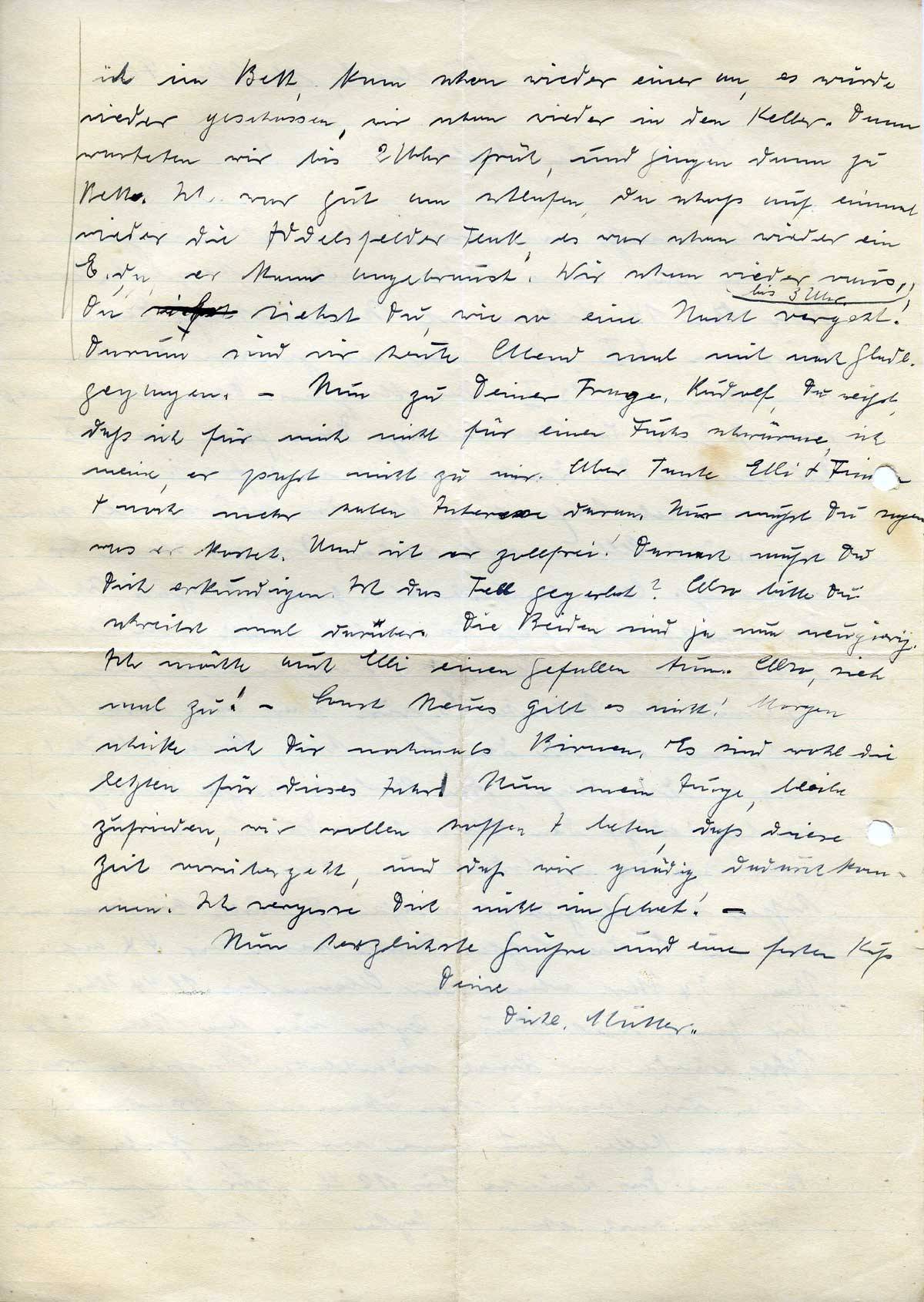 ich im Bett, kam schon wieder einer an, es wurde wieder geschossen, wir schon wieder in den Keller. Dann warteten wir bis 2 Uhr früh, und gingen dann zu Bett. Ich war gut am schlafen, da schoß auf einmal wieder die Iddelsfelder Flak, es war schon wieder ein E. da, er kam angebraust. Wir schon wieder raus bis 3 Uhr. Da siehst Du, wie so eine Nacht vergeht! Darum sind wir heute Abend mal mit nach Gladb. gegangen. – Nun zu Deiner Frage, Rudolf, Du weißt, daß ich für mich nicht für einen Fuchs schwärme, ich meine, er paßt nicht zu mir. Aber Tante Elli + Finchen + noch mehr haben Interesse daran. Nur mußt Du sagen, was er kostet. Und ist er zollfrei! Darnach mußt Du Dich erkundigen. Ist das Fell gegerbt? Also bitte Du schreibst mal darüber. Die Beiden sind ja nun neugierig. Ich möchte auch Elli einen Gefallen tuen. Also, sieh mal zu! – Sonst Neues gibt es nicht! Morgen schicke ich Dir nochmals Birnen. Es sind wohl die letzten für dieses Jahr! Nun mein Junge, bleibe zufrieden, wir wollen hoffen + beten, daß diese Zeit vorübergeht, und daß wir gnädig dadurchkommen. Ich vergesse Dich nicht im Gebet! –