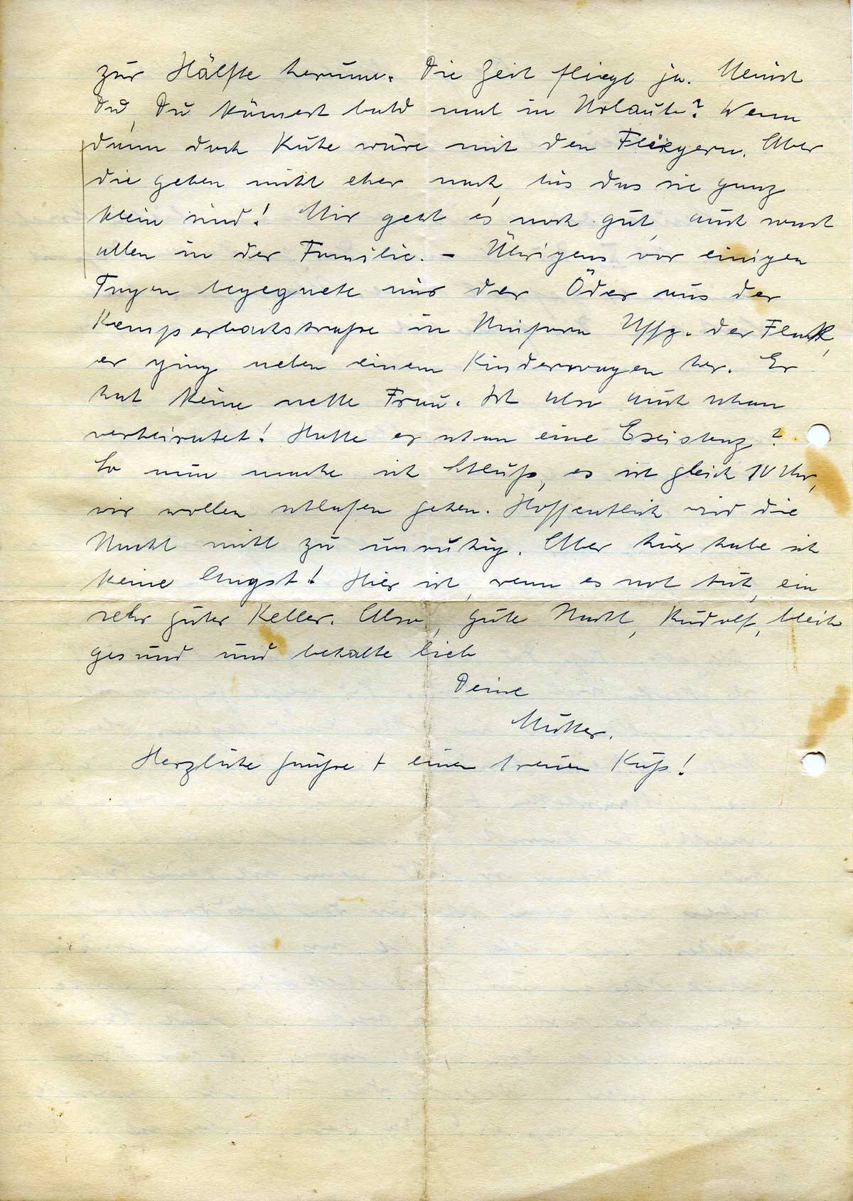 zur Hälfte herum. Die Zeit fliegt ja. Meinst Du, Du kämest bald mal in Urlaub? Wenn dann doch Ruhe wäre mit den Fliegern. Aber die geben nicht eher nach, bis das sie ganz klein sind! Mir geht es noch gut, auch sonst allen in der Familie. – Übrigens vor einigen Tagen begegnete mir der Öder aus der Kemperbachstraße in Uniform Uffz. der Flak, er ging neben einem Kinderwagen her. Er hat keine nette Frau. Ist also auch schon verheiratet! Hatte er schon eine Existenz? So nun mache ich Schluß, es ist gleich 10 Uhr, wir wollen schlafen gehen. Hoffentlich wird die Nacht nicht zu unruhig. Aber hier habe ich keine Angst! Hier ist, wenn es not tut, ein sehr guter Keller. Also, gute Nacht, Rudolf, bleibe gesund und behalte lieb