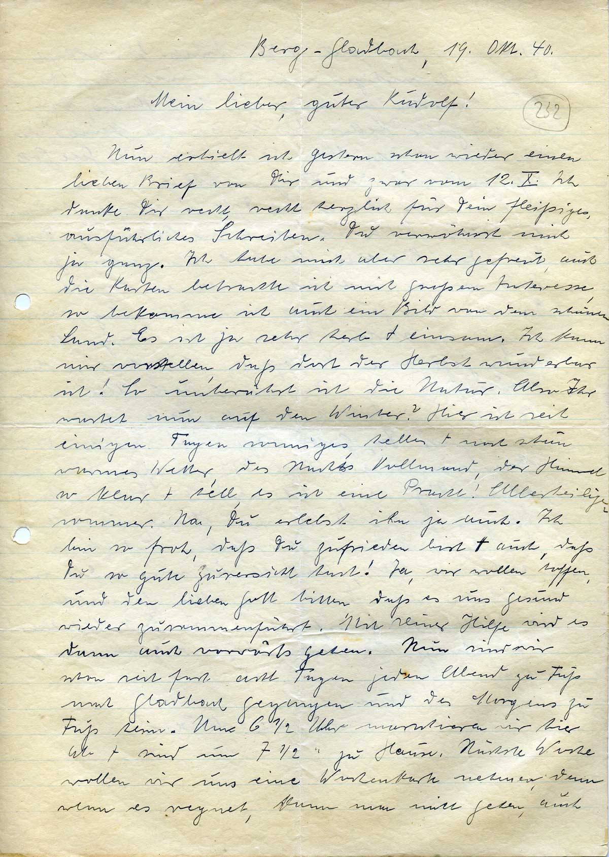 Nun erhielt ich gestern schon wieder einen lieben Brief von Dir und zwar vom 12.X. Ich danke Dir recht, recht herzlich für Dein fleißiges, ausführliches Schreiben. Du verwöhnst mich ja ganz. Ich habe mich aber sehr gefreut, auch die Karten betrachte ich mit großem Interesse, so bekomme ich auch ein Bild von dem schönen Land. Es ist ja sehr herb + einsam. Ich kann mir vorstellen, daß dort der Herbst wunderbar ist! So unberührt ist die Natur. Also Ihr wartet nun auf den Winter? Hier ist seit einigen Tagen sonniges, helles + noch schön warmes Wetter, des Nachts Vollmond, der Himmel so klar + hell, es ist eine Pracht! Allerheiligensommer. Na, Du erlebst ihn ja auch. Ich bin so froh, daß Du zufrieden bist + auch, daß Du so gute Zuversicht hast! Ja, wir wollen hoffen, und den lieben Gott bitten, daß es uns gesund wieder zusammenführt. Mit seiner Hilfe wird es dann auch vorwärts gehen. Nun sind wir schon seit fast acht Tagen jeden Abend zu Fuß nach Gladbach gegangen und des Morgens zu Fuß heim. Um 6 ½ Uhr marschieren wir hier ab + sind um 7 ½ zu Hause. Nächste Woche wollen wir uns eine Wochenkarte nehmen, denn wenn es regnet, kann man nicht gehen, auch