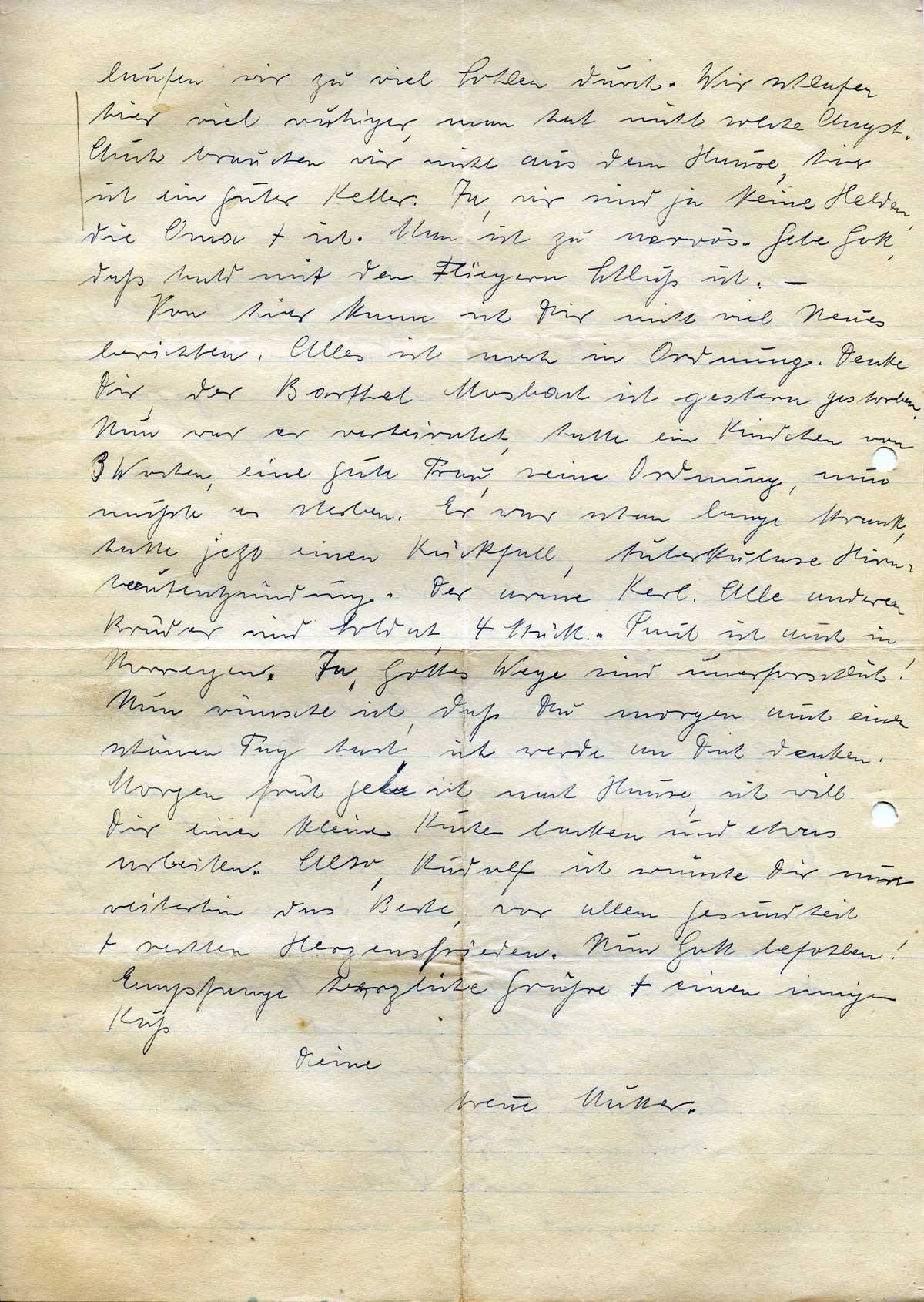 laufen wir zu viel Sohlen durch. Wir schlafen hier viel ruhiger, man hat nicht solche Angst. Auch brauchen wir nicht aus dem Hause, hier ist ein guter Keller. Ja, wir sind ja keine Helden, die Oma + ich. Man ist zu nervös. Gebe Gott, daß bald mit den Fliegern Schluß ist. –