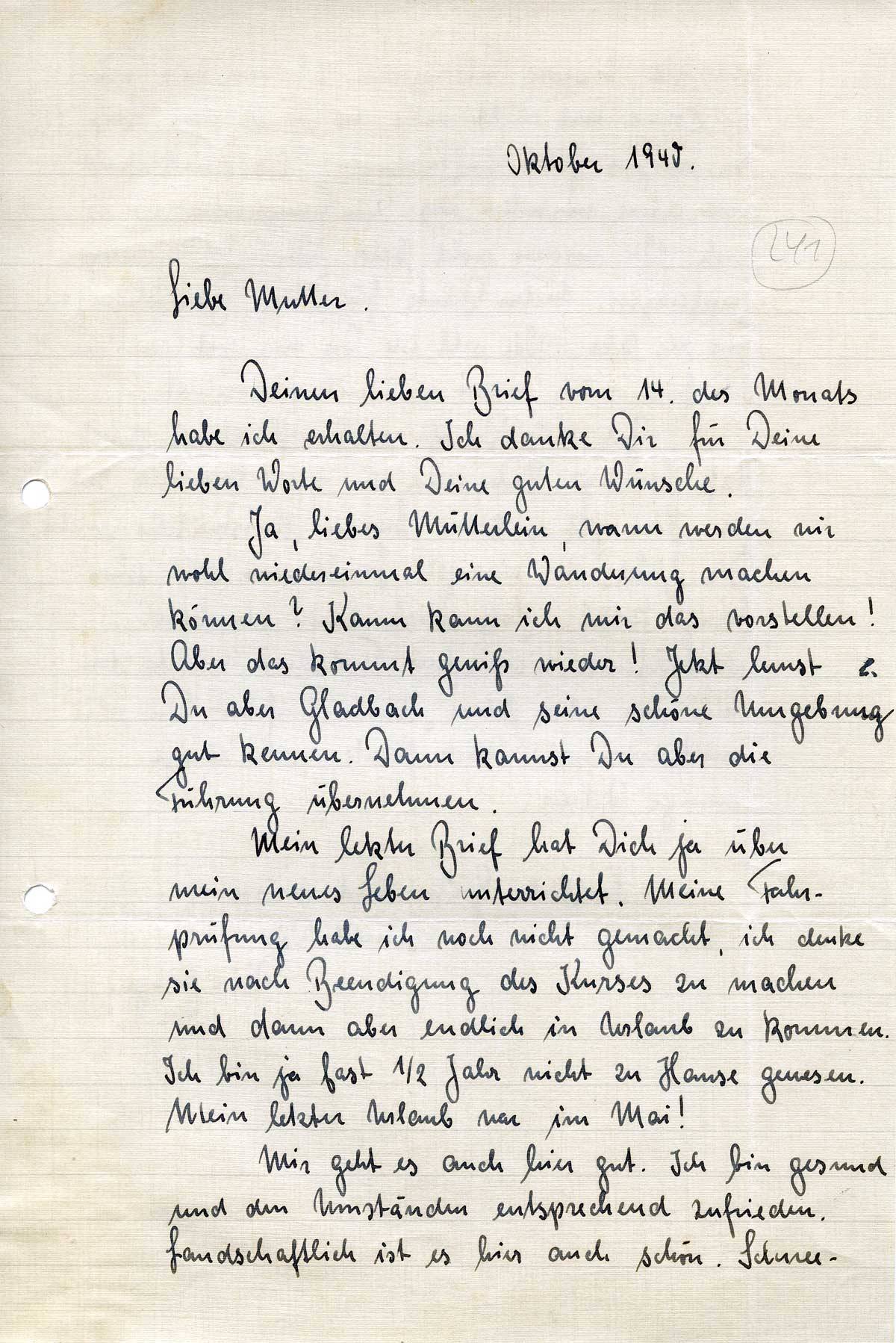 Mein letzter Brief hat Dich ja über mein neues Leben unterrichtet. Meine Fahrprüfung habe ich noch nicht gemacht, ich denke sie nach Beendigung des Kursus zu machen und dann aber endlich in Urlaub zu kommen. Ich bin ja fast ½ Jahr nicht zu Hause gewesen. Mein letzter Urlaub war im Mai!