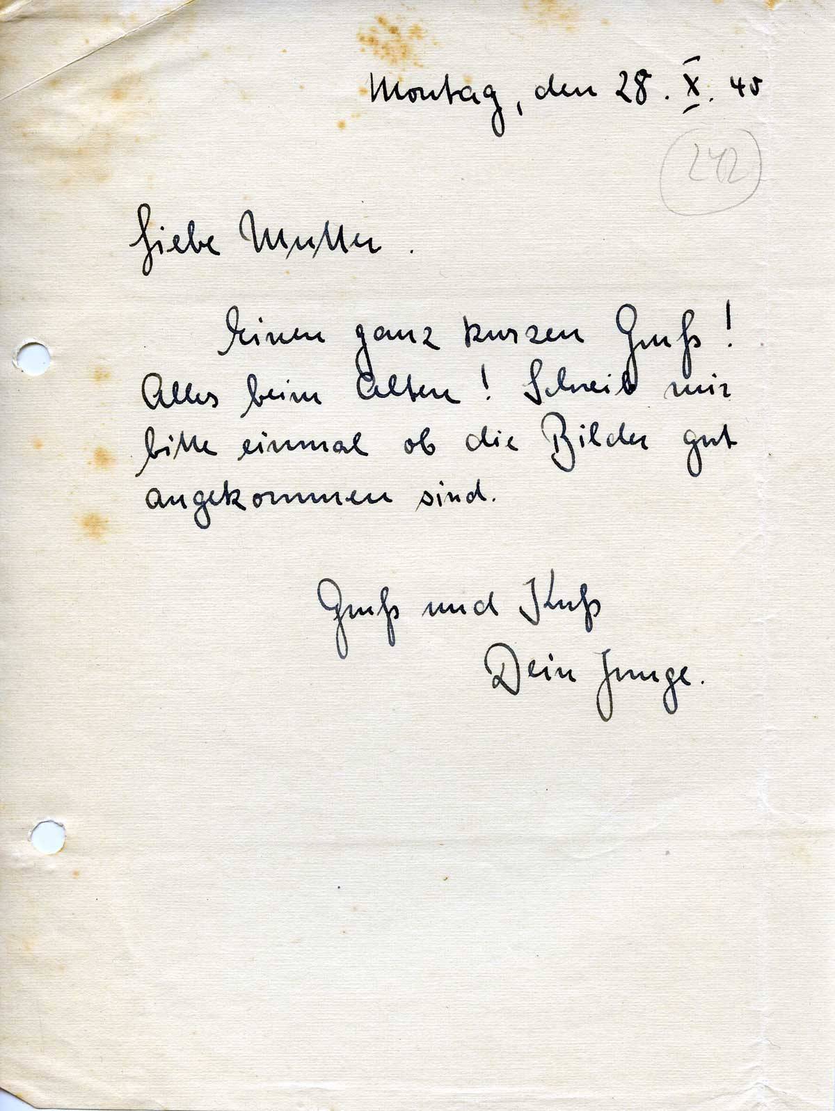 Rudolf Schmitz an Mutter Anna, 28. Oktober 1940 Montag, den 28.X.40 Liebe Mutter. Einen ganz kurzen Gruß! Alles beim Alten! Schreib mir bitte ob die Bilder gut angekommen sind. Gruß und Kuß Dein Junge.