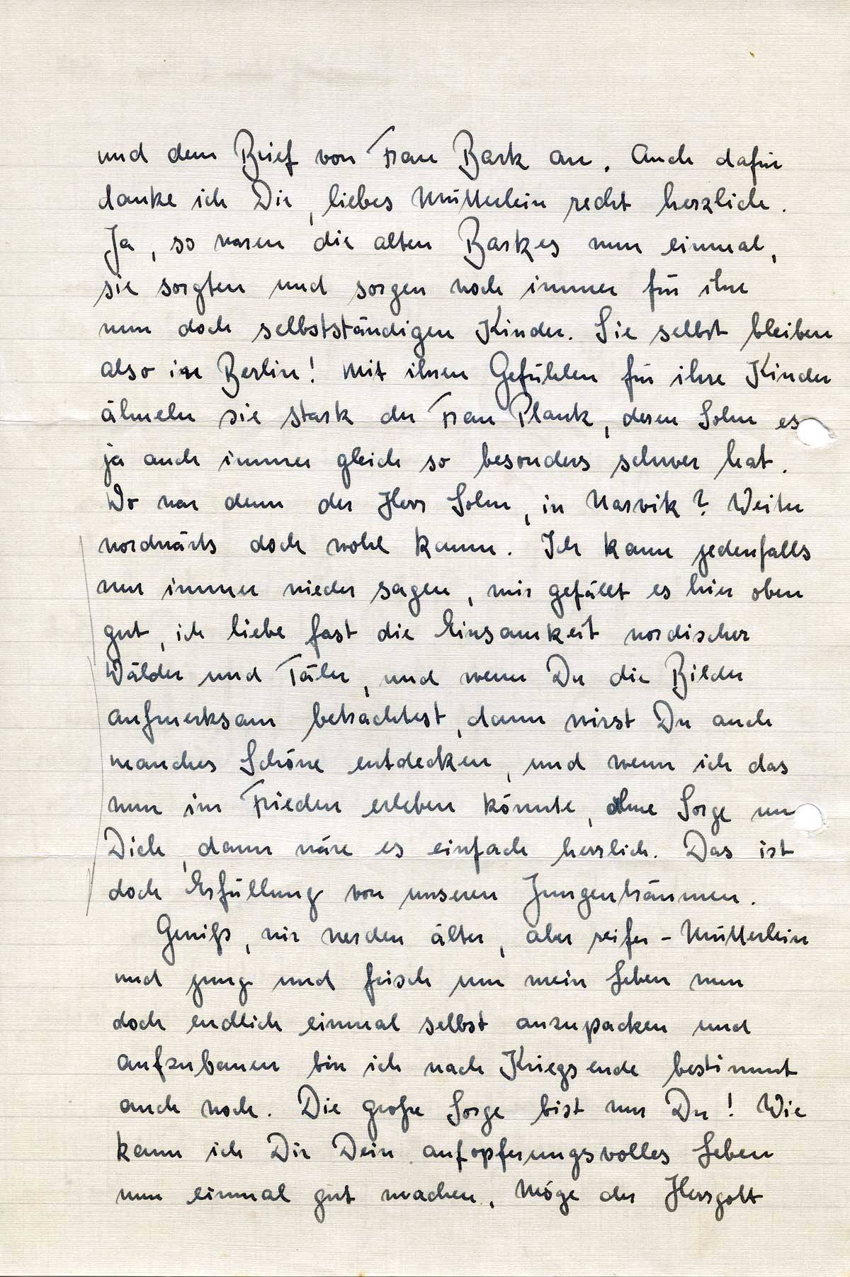 und dem Brief von Frau Bartz an. Auch dafür danke ich Dir, liebes Mütterlein recht herzlich. Ja, so waren die alten Bartzes nun einmal, sie sorgten und sorgen noch immer für ihre nun doch selbstständigen Kinder. Sie selbst bleiben also in Berlin! Mit ihren Gefühlen für ihre Kinder ähneln sie stark der Frau Plantz, deren Sohn es ja auch immer gleich so besonders schwer hat. Wo war denn der Herr Sohn, in Narvik? Weiter nordwärts doch wohl kaum. Ich kann jedenfalls nur immer wieder sagen, mir gefällt es hier oben gut, ich liebe fast die Einsamkeit nordischer Wälder und Täler, und wenn Du die Bilder aufmerksam betrachtest, dann wirst Du auch manches Schöne entdecken, und wenn ich das nun im Frieden erleben könnte, ohne Sorge um Dich, dann wäre es einfach herrlich. Das ist doch Erfüllung von unseren Jungenträumen.