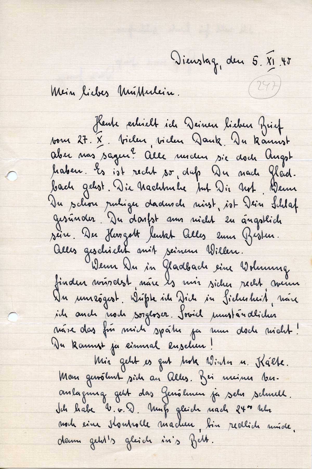 Heute erhielt ich Deinen lieben Brief vom 27.X. Vielen, vielen Dank. Du kannst aber was sagen? Alle werden sie doch Angst haben. Es ist recht so, daß Du nach Gladbach gehst. Die Nachtruhe tut Dir Not. Wenn Du schon ruhiger dadurch wirst, ist Dein Schlaf gesünder. Du darfst nur nicht zu ängstlich sein. Der Herrgott lenkt Alles zum Besten. Alles geschieht mit seinem Willen.
