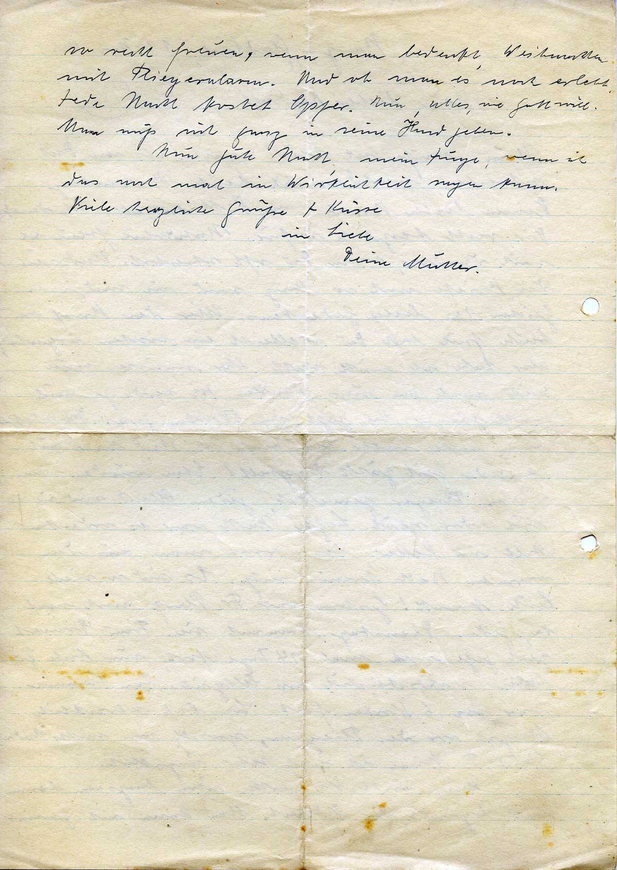 Nun muß ich heute nochmals an Dich schreiben, nachdem ich heute Nachmittag Deinen lieben Brief vom 8.11. erhielt. Ich danke Dir recht herzlich dafür. Natürlich freue ich mich darüber, wenn Du oft schreibst. Und wenn die Briefe noch so kurz sind, sie sind ja ein Zeichen des lieben Gedenkens. Über den Brief von heute früh bist Du vielleicht ein bischen ärgerlich, aber habe ich nicht recht! Wir müssen nun auch mal an uns denken. Ich werde ja auch nicht jünger, bin jetzt im 50.sten Jahr. Da schafft man nicht mehr wie mit 30. Und diese aufregende Zeit zählt doppelt! Eben wurden schon wieder Flieger gemeldet, jeden Abend sind sie da, früh oder spät. Letzte Nacht war es ordentlich kalt im Keller, bes., wenn man aus dem warmen Bett heraus muß. Es sind so viele Leute krank! Gestern war Fr. Plantz noch mal da, jeden Dienstag kommt sie. Frau Ermert geht jetzt noch mal 14 Tage fort, um Ruhe zu haben, wahrscheinlich im Allgäu. Im Sommer war sie 6 Wochen fort. Sie hat schreckliche Angst vor den Fliegern, spricht von nichts anderem. Auch T. Stina ist noch sehr ängstlich.