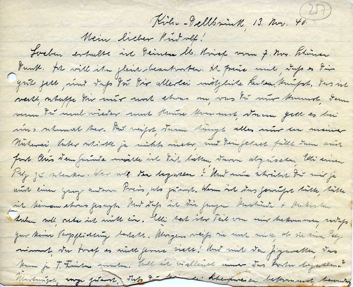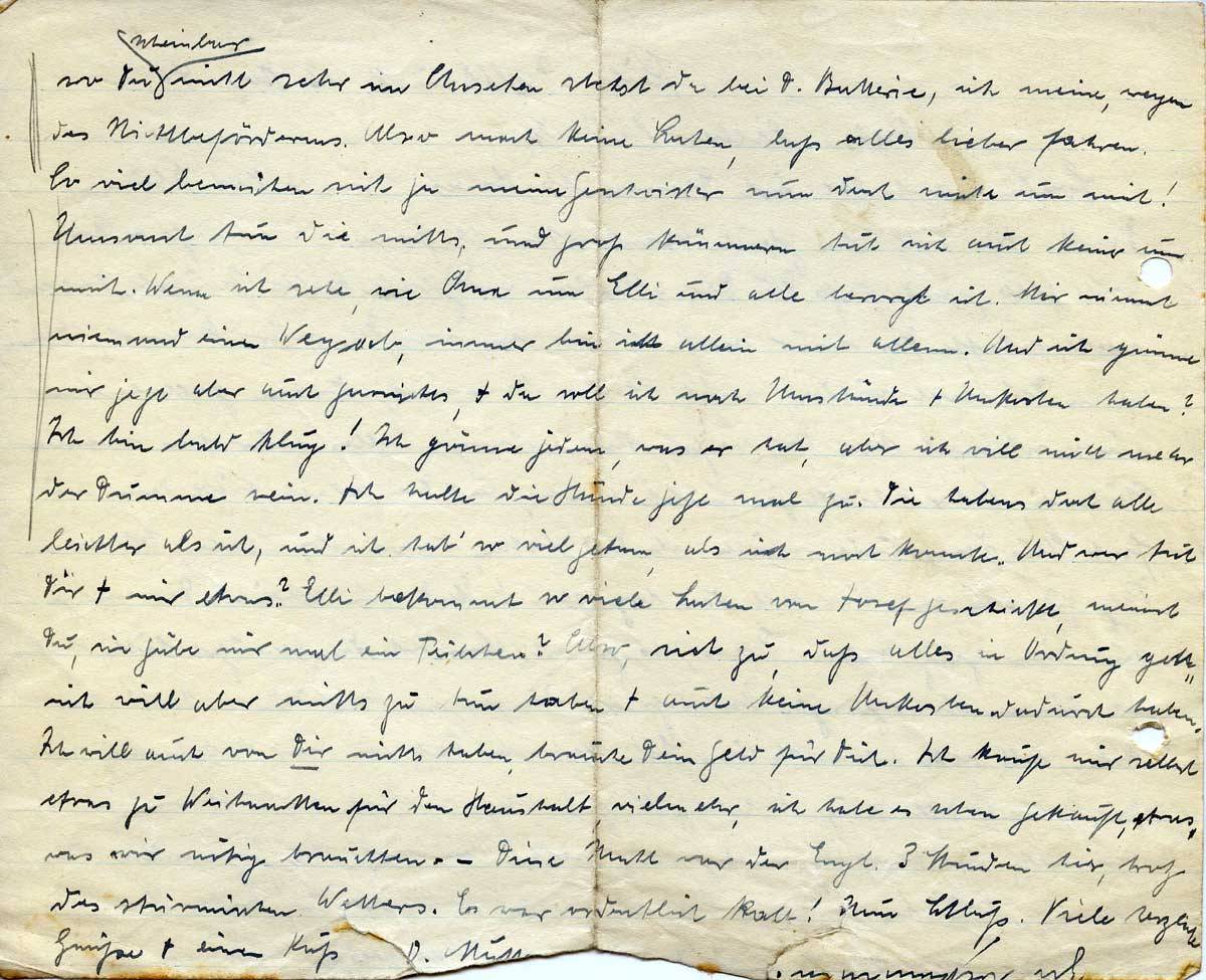 Soeben erhalte ich Deinen lb. Brief vom 7. Nov. Schönen Dank. Ich will ihn gleich beantworten. Ich freue mich, daß es Dir gut geht, und daß Du Dir allerlei nützliche Sachen kaufst. Das ist recht, schaffe Dir nur noch etwas an, was Du nur kannst, denn wenn Du mal wieder nach Hause kommst, dann geht es bei uns schmal her. Du weißt, dann hängt alles nur an meiner Näherei, Vater schickt ja nichts mehr, und Dein Gehalt fällt dann auch fort. Aus dem Grunde möchte ich Dich bitten, davon abzusehen, Elli einen Pelz zu schenken. Wer soll das bezahlen? Und nun schreibst Du mir ja auch einen ganz anderen Preis, als zuerst. Wenn ich das gewußt hätte, hätte ich keinem etwas gesagt. Und daß ich die ganzen Umstände + Unkosten haben soll, sehe ich nicht ein. Elli hat ihr Teil von mir bekommen, sodaß gar keine Verpflichtung besteht. Übrigens weiß sie auch nicht, ob sie einen Pelz nimmt, da Josef es nicht gerne sieht! Und mit den Zigaretten, das kann ja T. Finchen machen. Soll ich vielleicht immer das Porto bezahlen? Überhaupt, sorge zuerst, daß Du keinerlei Schereien bekommst, besonders